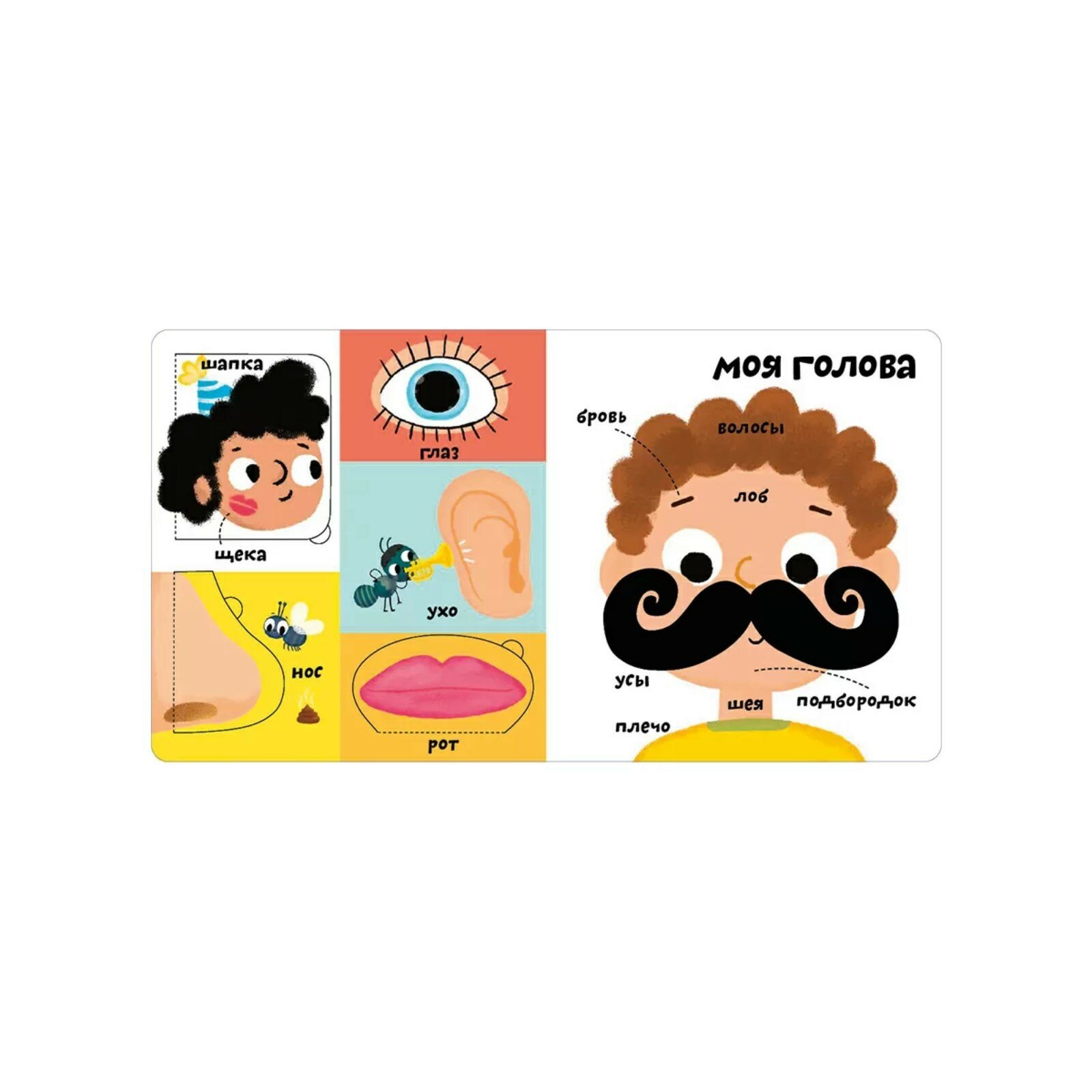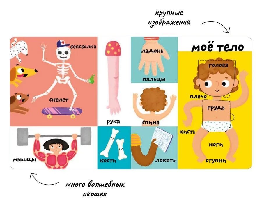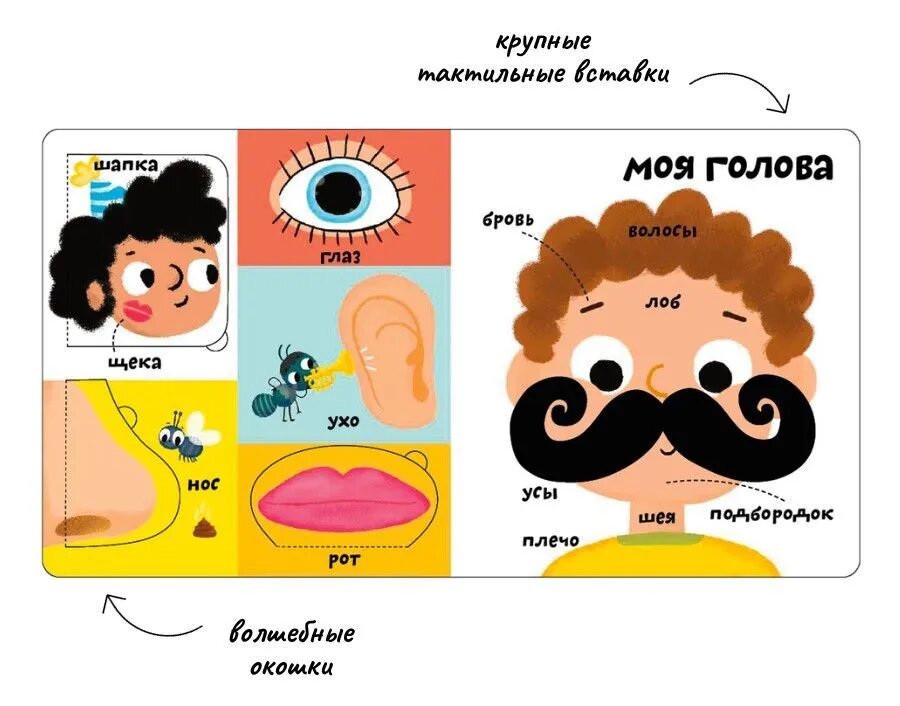 Благодаря ярким иллюстрациям, тактильным вставкам и большим окошкам ребёнок с лёгкостью пополнит свой словарный запас, изучит много нового и познавательного.