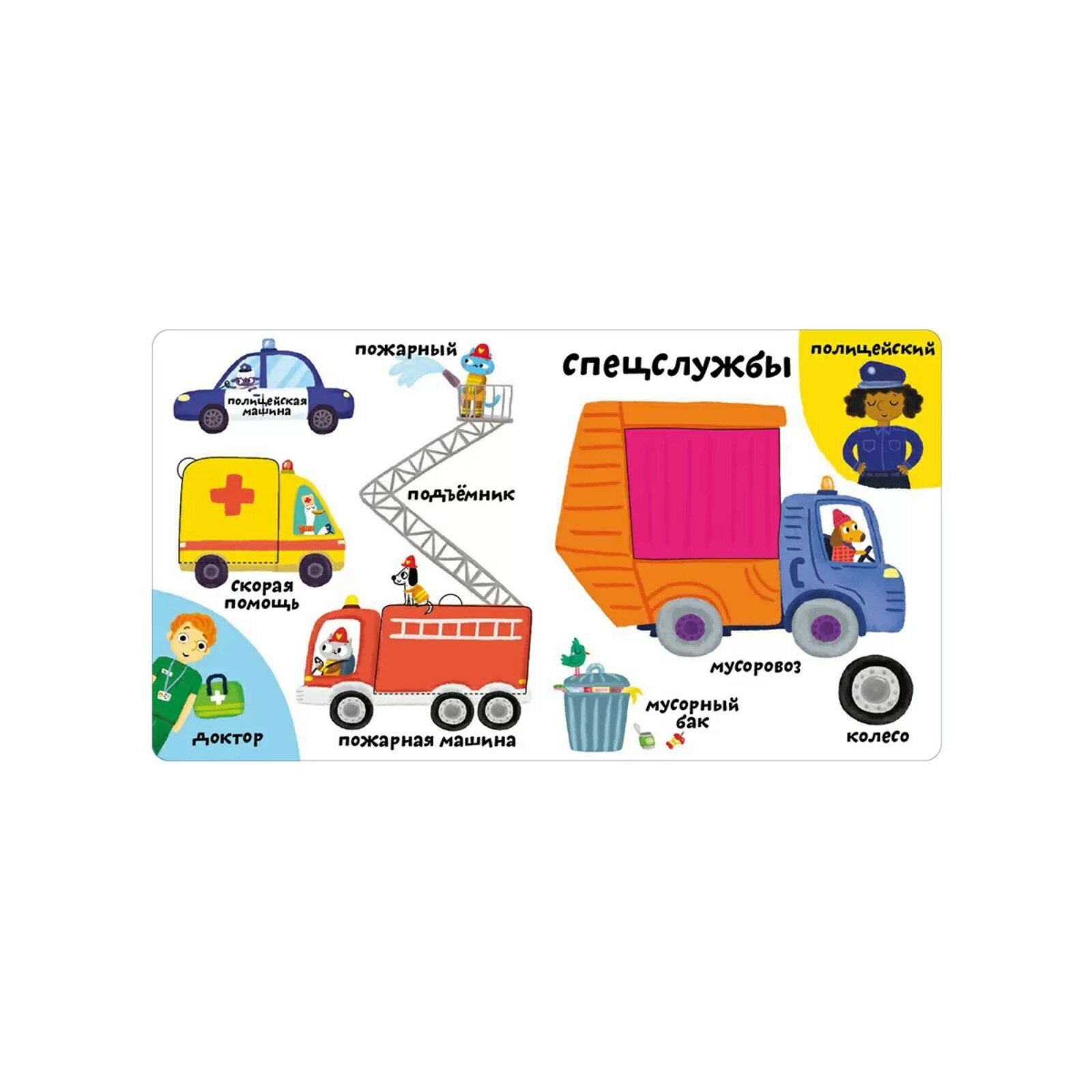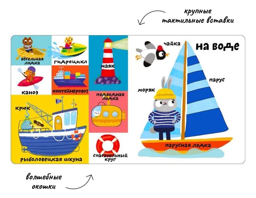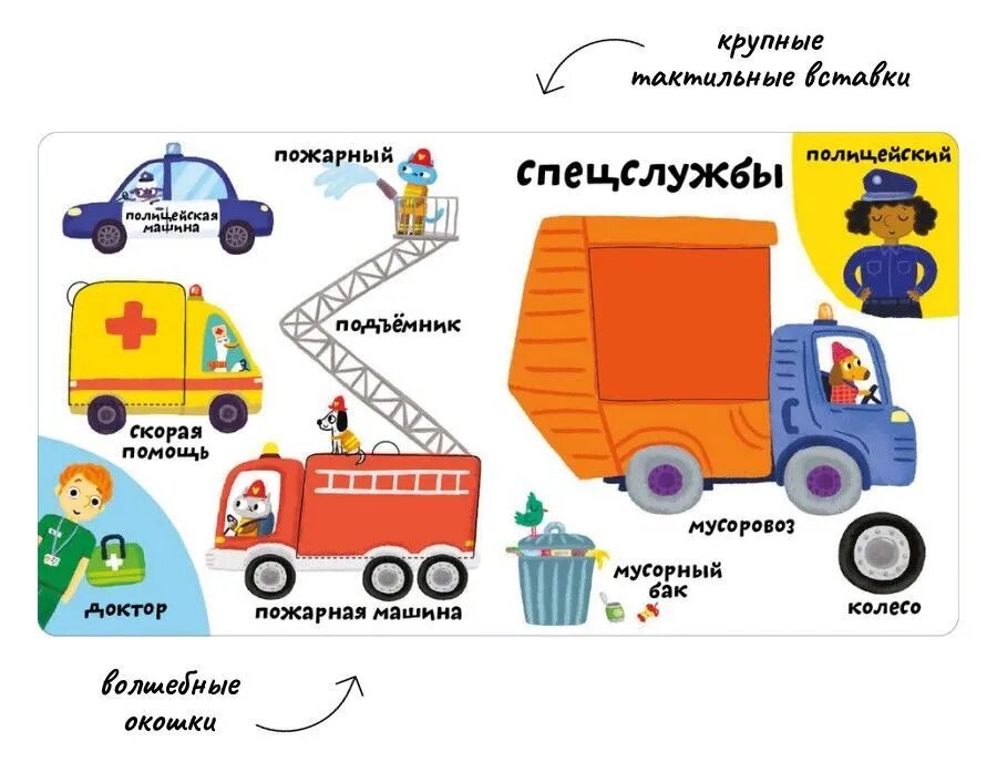 Благодаря ярким иллюстрациям, тактильным вставкам и большим окошкам ребёнок с лёгкостью пополнит свой словарный запас, изучит много нового и познавательного.