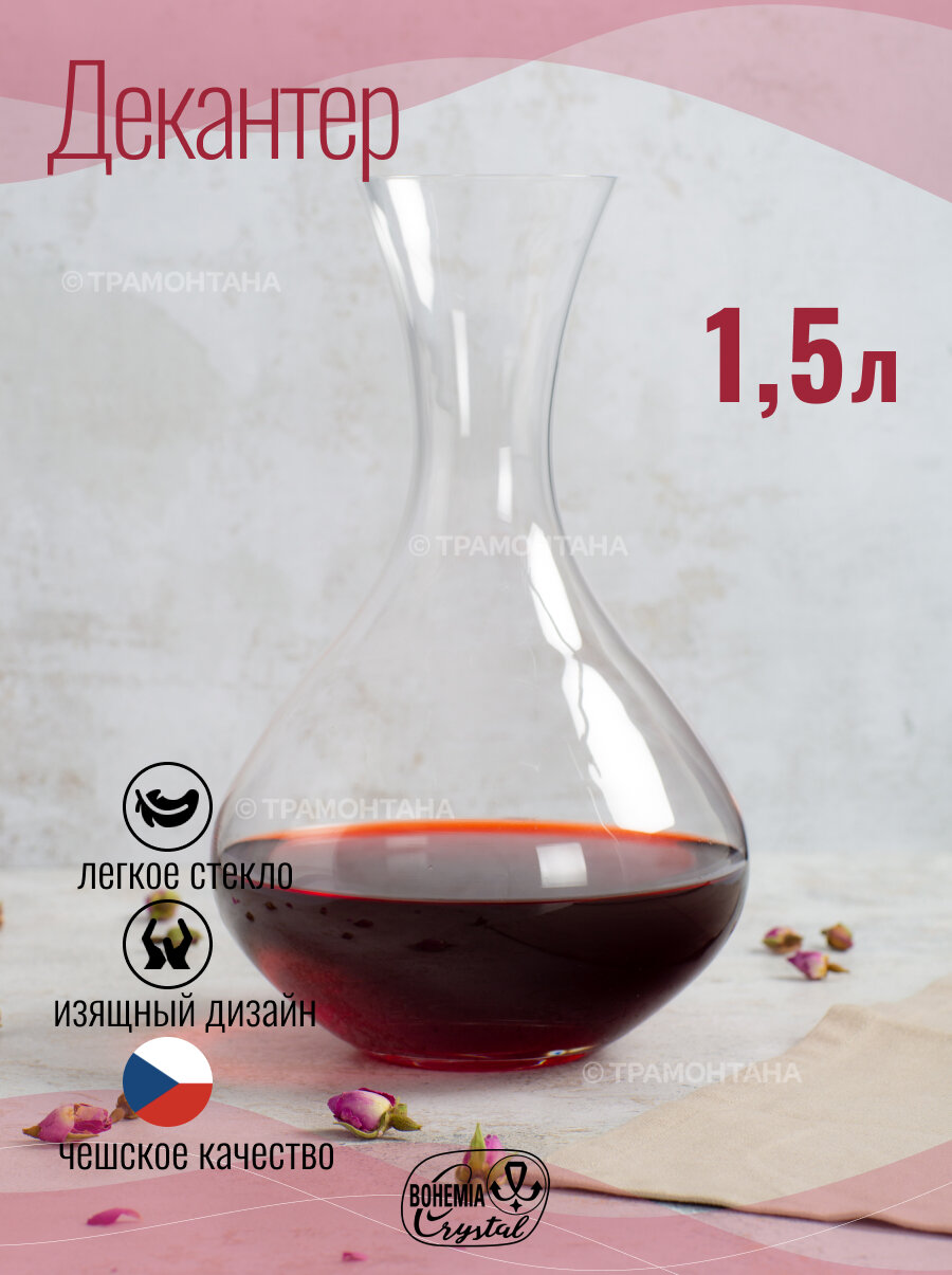 Декантер - стеклянный графин из богемского стекла, предназначенный для подачи вина. Классические графины производят из прозрачного стекла. Особенностью богемского стекла является непревзойденное качество, прозрачность и яркое сверкание граней. Стекло звенит долгим чистым звуком. Предназначен для подачи холодных напитков, для сервировки стола.