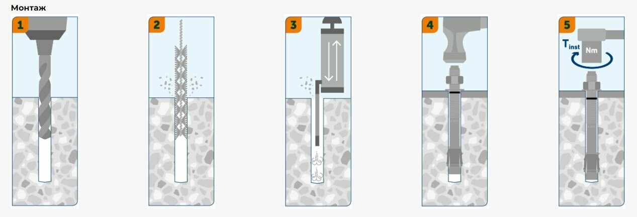 Клиновой анкер c регулируемым моментом затяжки предназначен для использования в напряженном и ненапряженном (без трещин) бетоне. Также его можно устанавливать в плотных основаниях, таких как полнотелый кирпич (M8) и натуральный камень. Анкер заранее собран и готов к прямому сквозному монтажу.