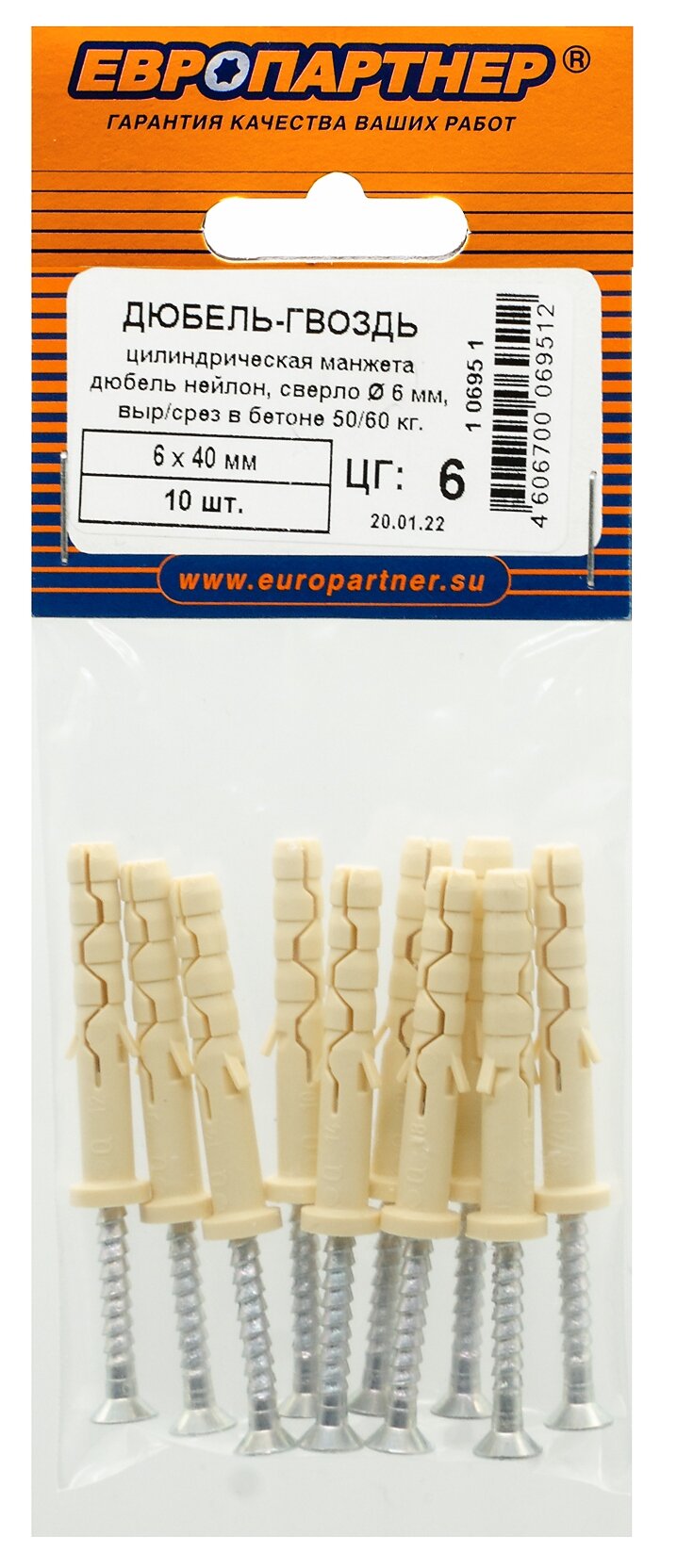 На сегодняшний день товар «Дюбель-гвоздь PDG LK с цилиндрической манжетой 6 x 40 10 штук Европартнер» можно купить с кешбеком в 1 магазине: Яндекс.Маркет