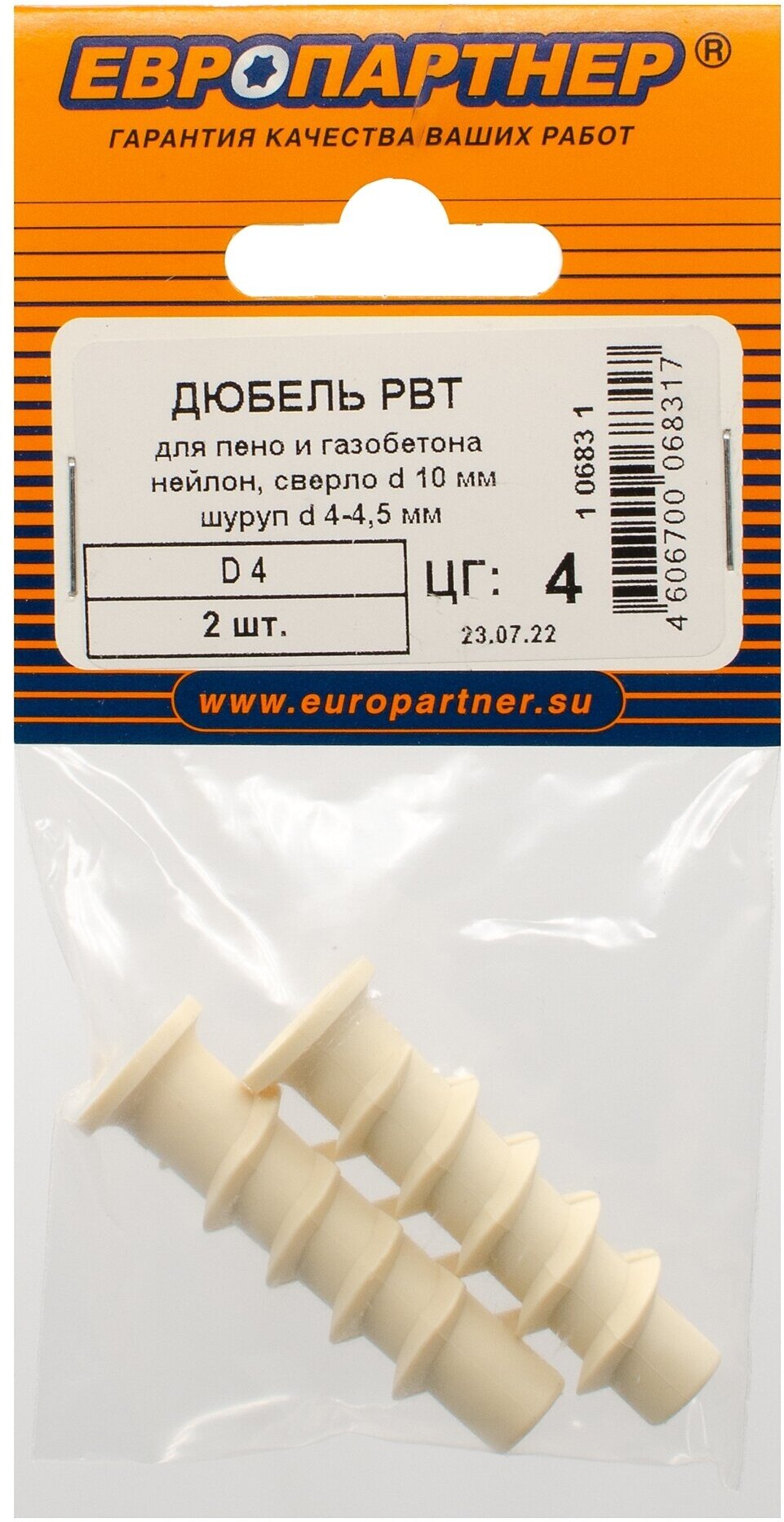 На сегодняшний день товар «Дюбель для легкого бетона КВТ 4 2 штуки Европартнер PBT 4 2шт.» можно купить с кешбеком в 1 магазине: Яндекс.Маркет