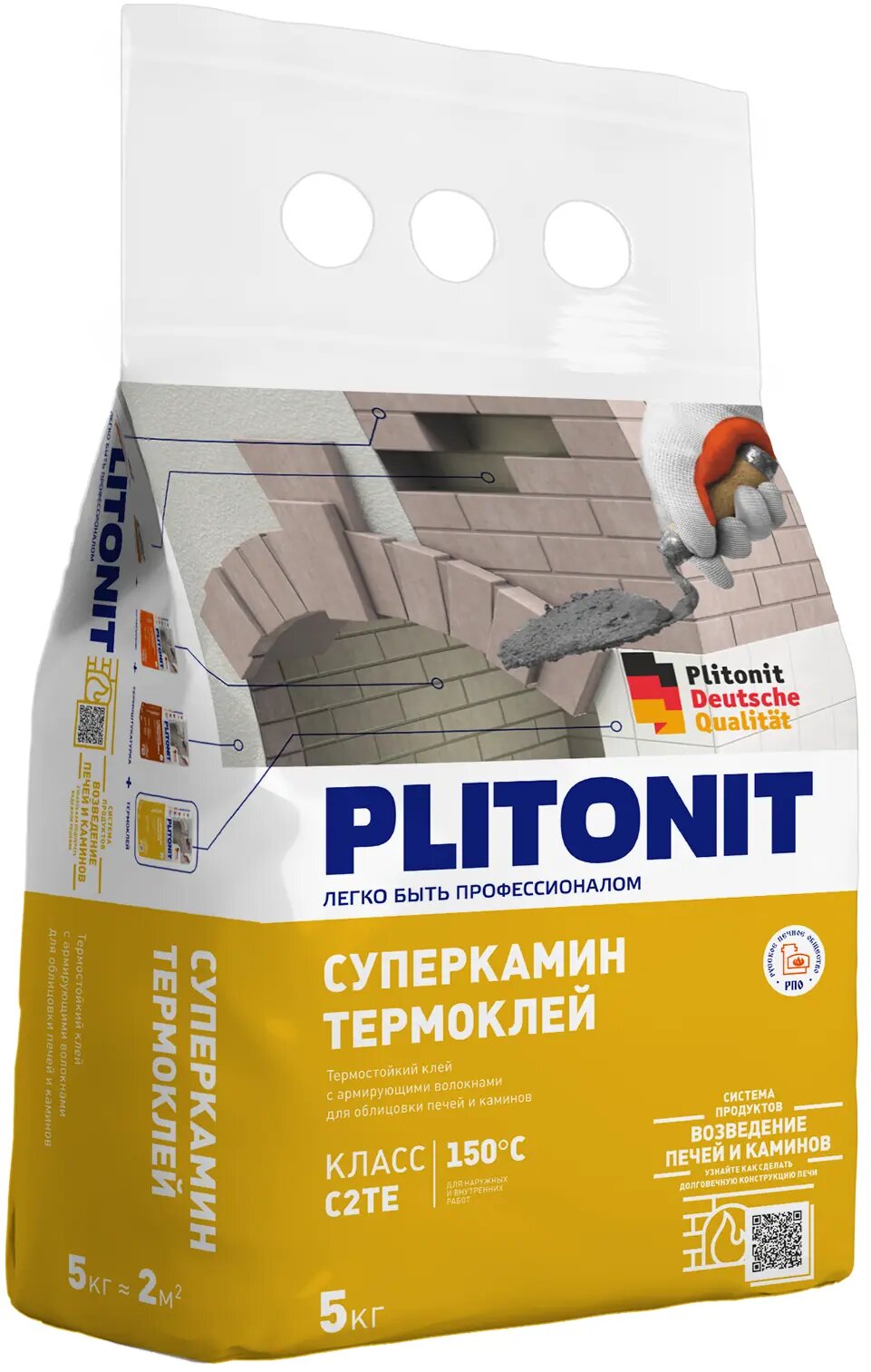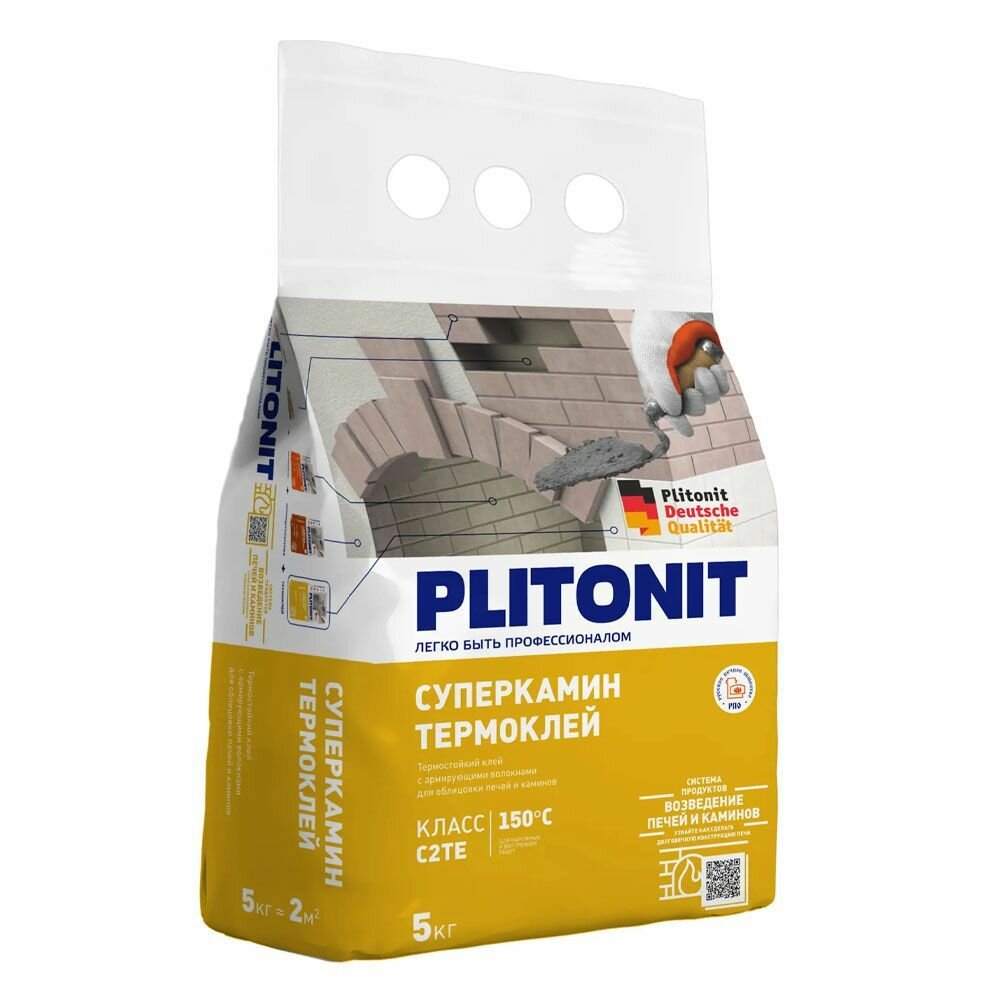 Содержит армирующие волокна для облицовки печей и каминов. Предназначен для приклеивания облицовочной плитки из керамики, керамогранита, натурального и искусственного камня при отделке кирпичных поверхностей печей, каминов и бетонных оснований, подверженных температурному воздействию внутри помещений. Может также применяться в качестве шпаклевки и затирки для швов между плитками на основаниях, подверженных воздействию температуры.
