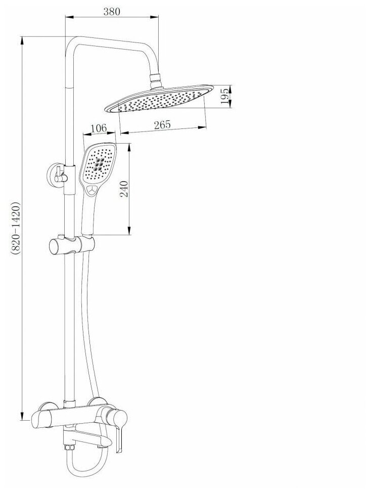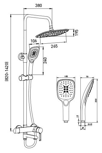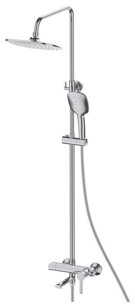 - Комплектация: стойка душевая 1 шт., лейка нижняя 1 шт., лейка верхняя 1 шт., дивертор 1 компл., держатель для лейки 1 шт., паспорт 1 шт., крепеж 1 компл.
