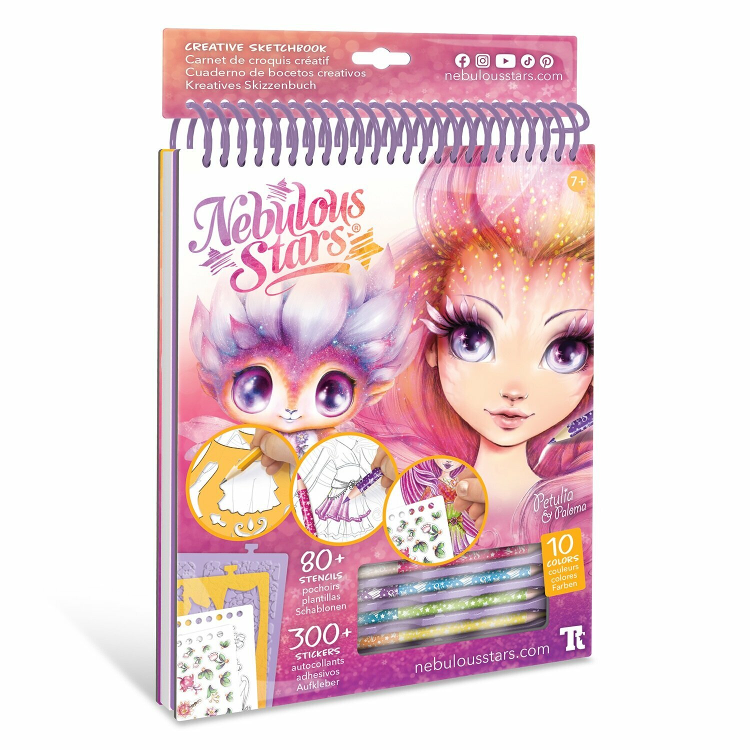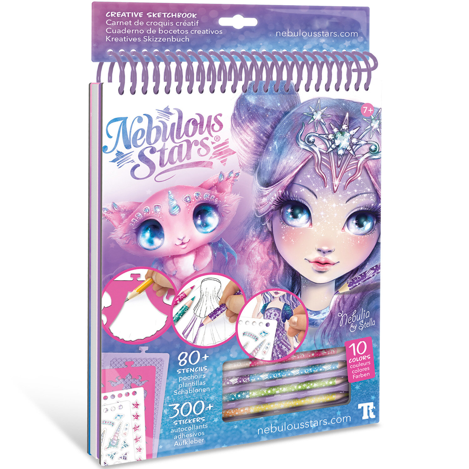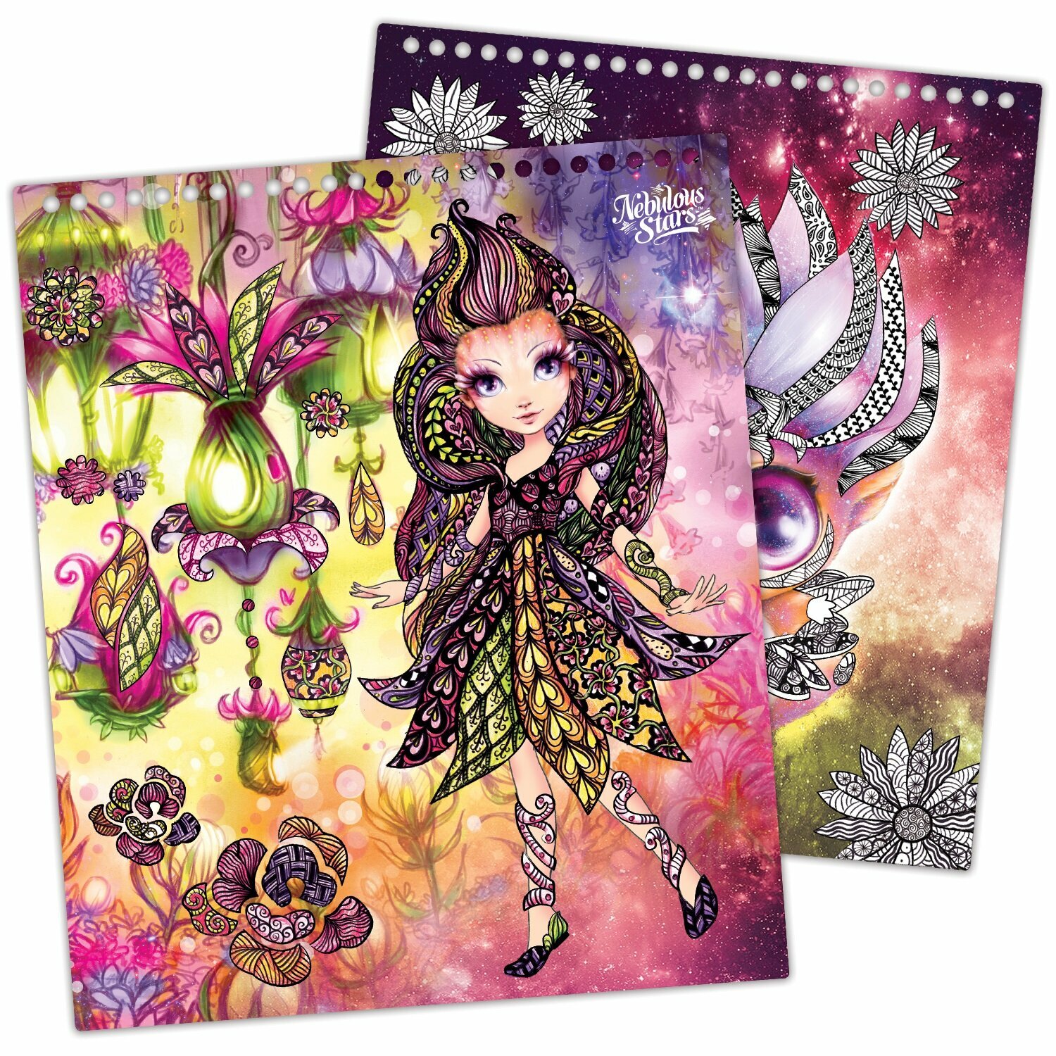 Комплектация: 35 страниц с эскизами, 80 трафаретов, 3 рисунка для втирания, 300 наклеек, 5 цветных карандашей, 8 техник рисования, полная история звездочки Nebulia, теория цвета, инструкция.