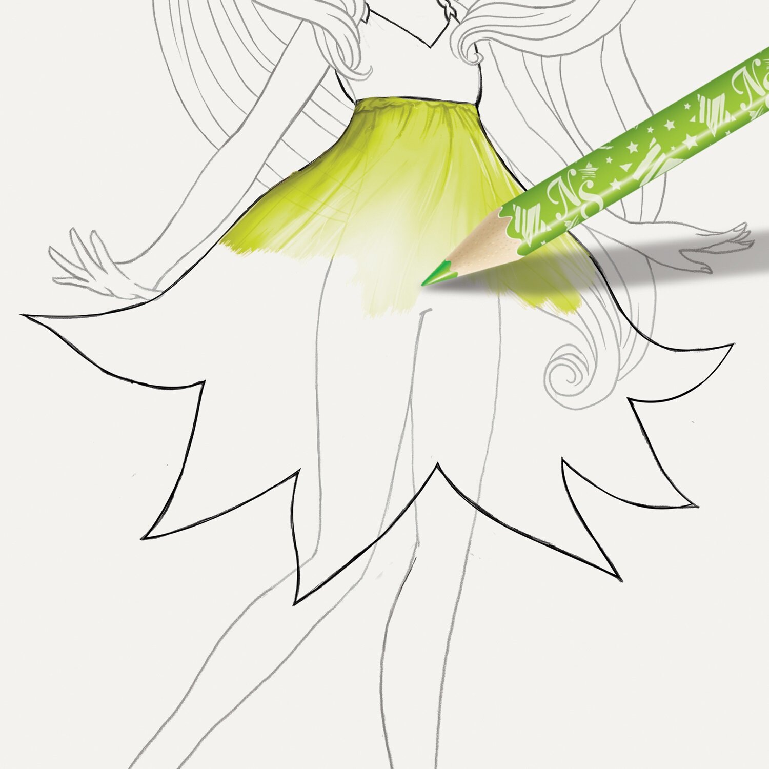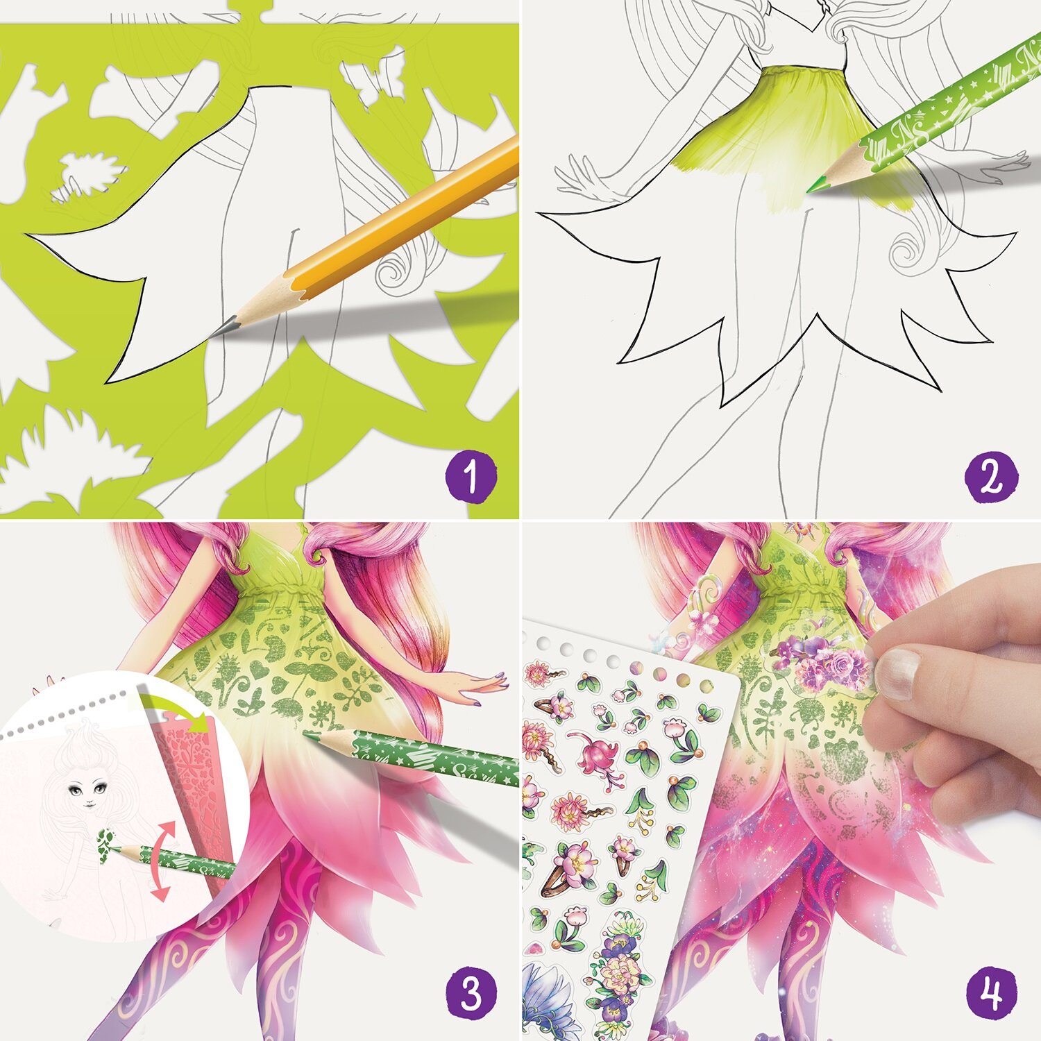 Раскраска для девочек - скетчбук с набором трафаретов, рисунков для втирания, наклеек и техник рисования. Разукрашивание и декорирование 35 готовых эскизов с помощью цветных карандашей, трафаретов с одеждой и аксессуарами и большого количества наклеек. Карандаши неонового цвета хранятся в специализированном отсеке.