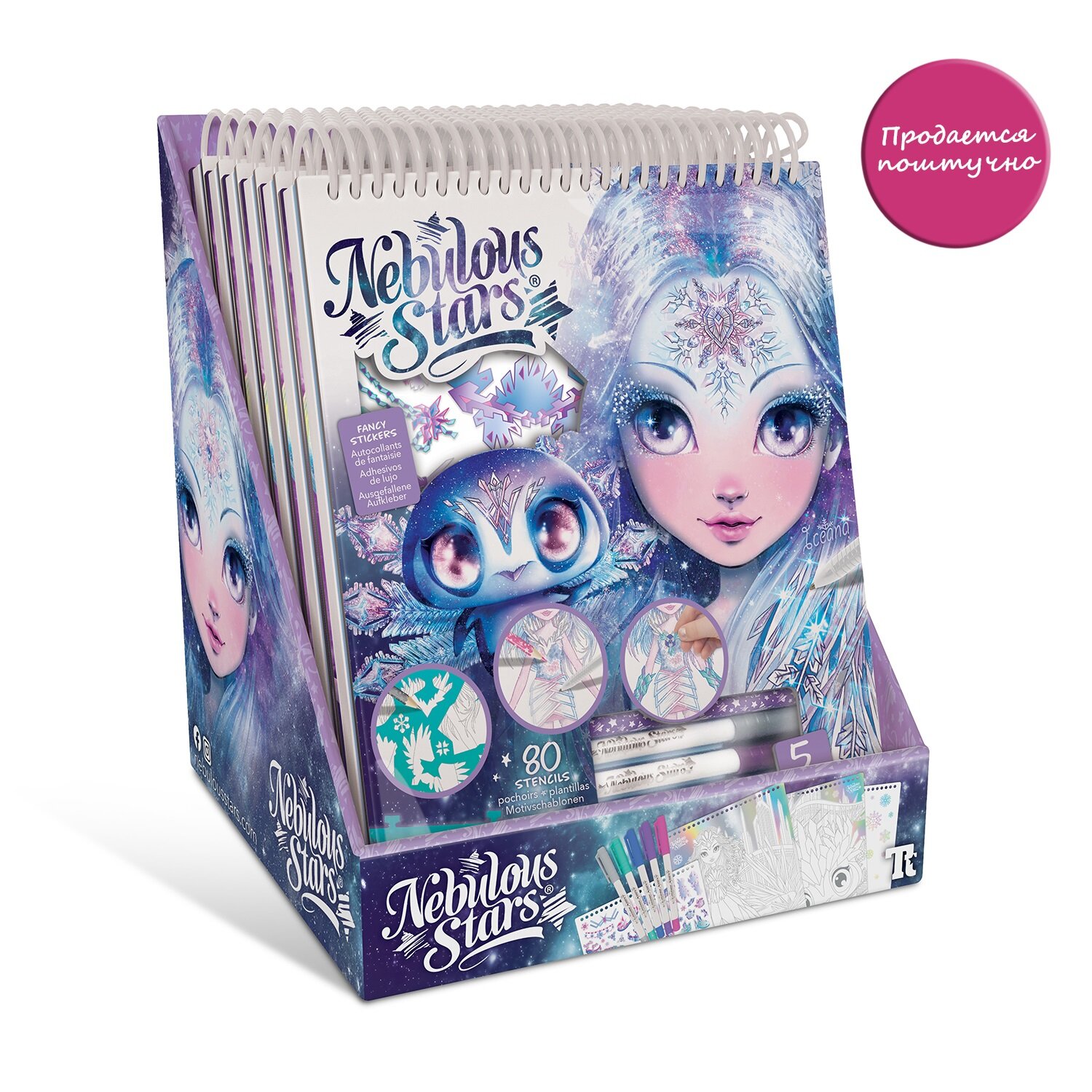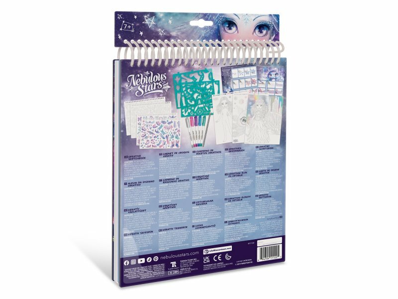 Комплектация: 30 страниц с эскизами, 80 трафаретов, более 110 необычных наклеек, карандаш (цвет серый), 5 фломастеров, 8 техник рисования, полная история звёздочки Iceana, инструкция.