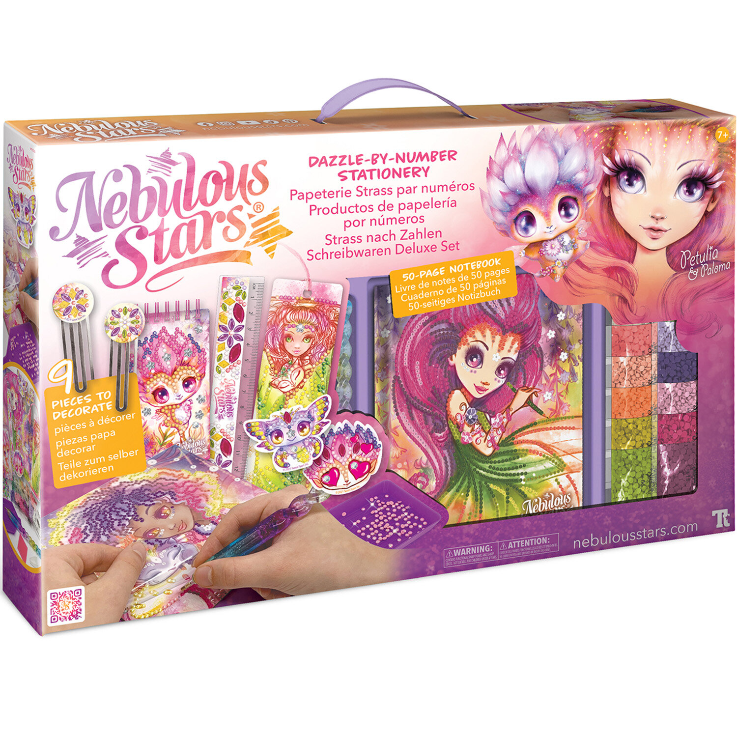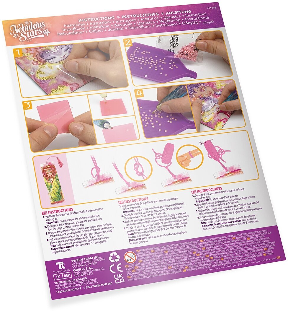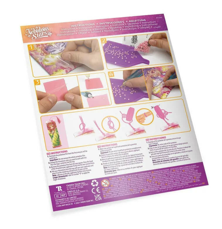 Комплектация: более 5000 стразов, качественный аппликатор для стразов, лоток для стразов и восковой квадрат, 9 готовых к декорированию изделий: блокнот, мини-блокнот для заметок, 2 магнита на холодильник, закладка, 2 скрепки и линейка, хлопковая нить, полная история звёздочки Petulia, инструкция.