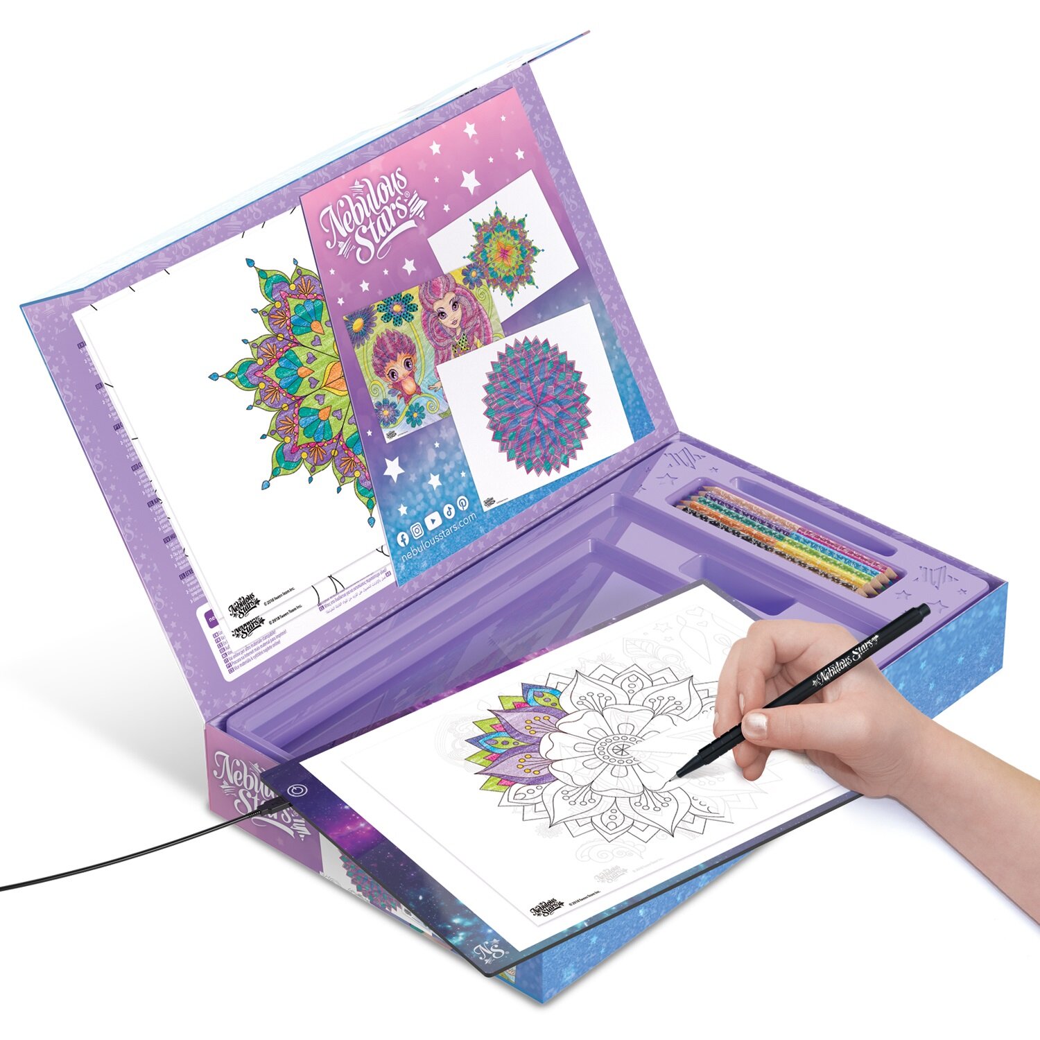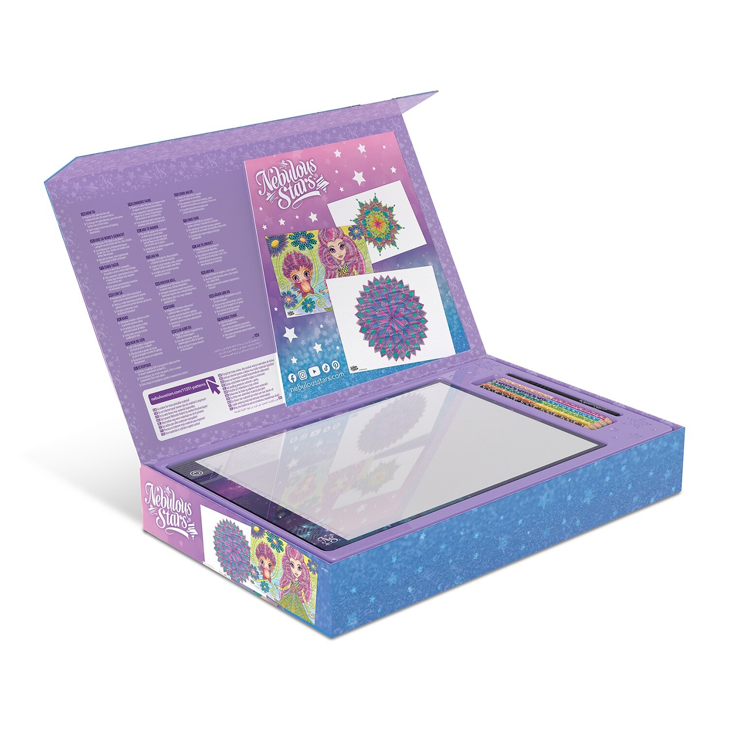 Комплектация: ультратонкая световая панель, USB-кабель, 5 двусторонних цветных карандашей, черная ручка для рисования, примеры страниц с шаблонами, 10 эскизов, полная история звёздочки Nebulia, коробка для хранения.