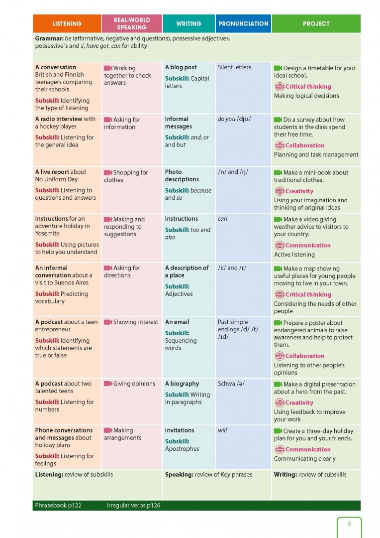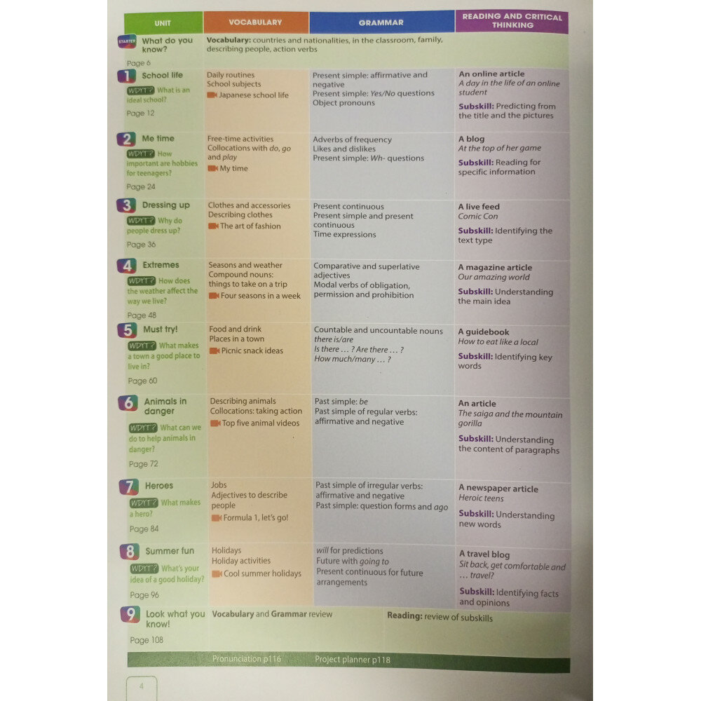 В каждом разделе учебника подростки собирают знания, язык и навыки, необходимые для того, чтобы иметь возможность ответить на WDYT? (What do you think?) вопрос, который открывает каждый блок.