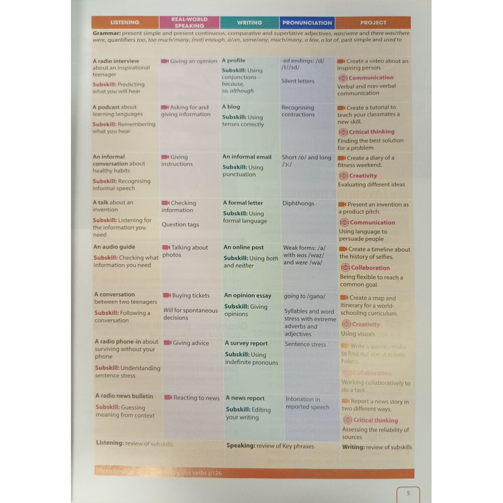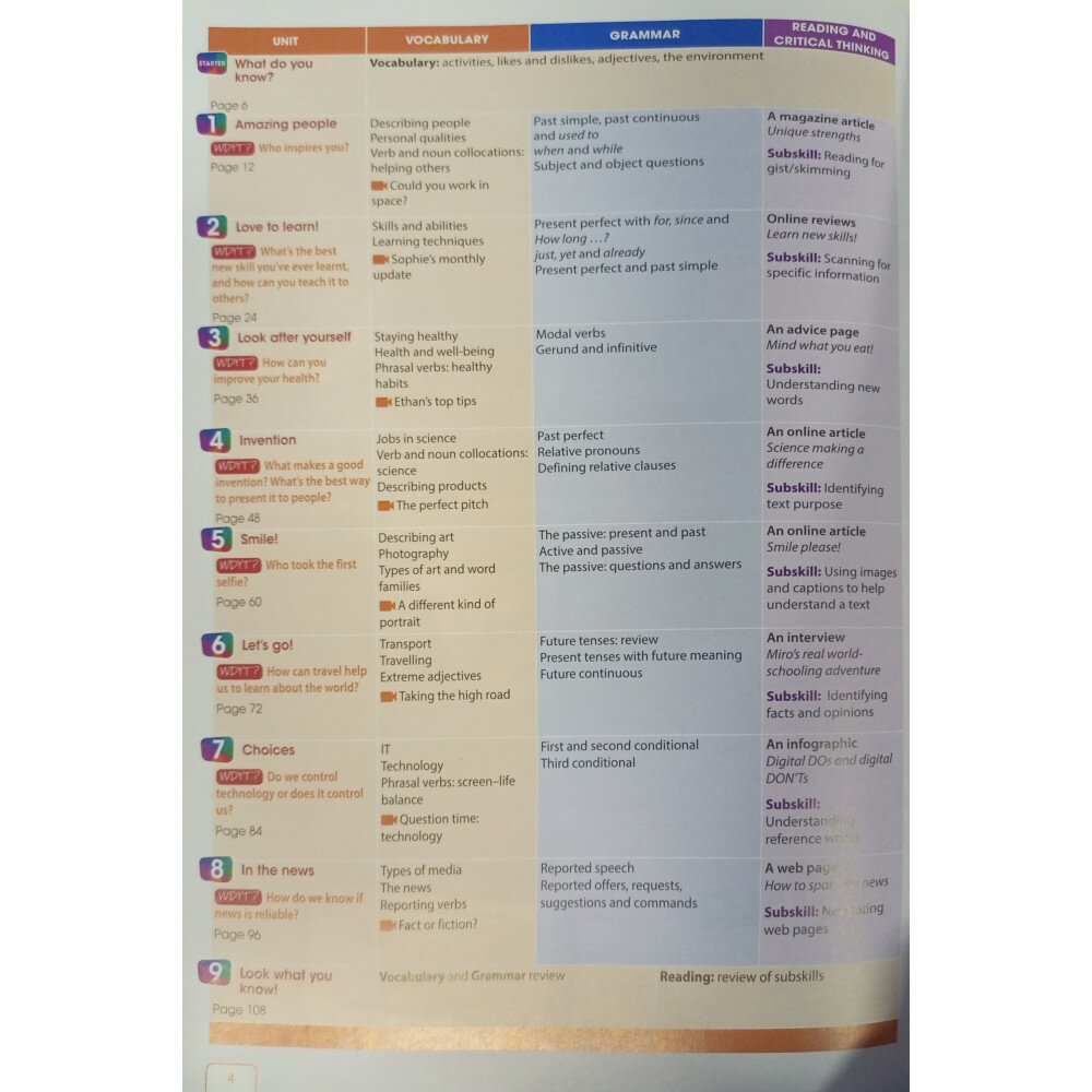 В каждом разделе учебника подростки собирают знания, язык и навыки, необходимые для того, чтобы иметь возможность ответить на WDYT? (What do you think?) вопрос, который открывает каждый блок.