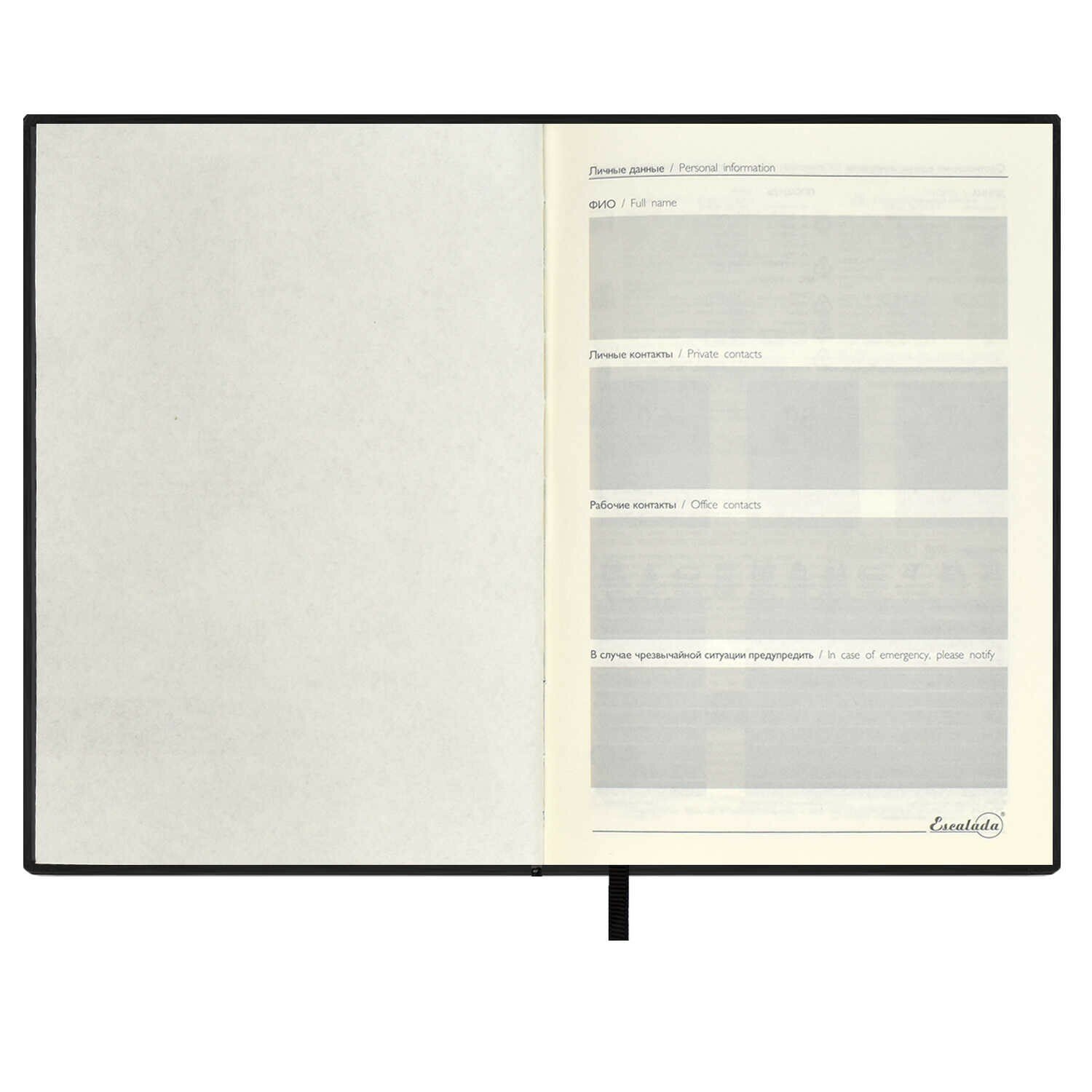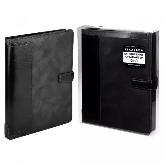 Ежедневник-органайзер недатированный ESCALADA, формат А5+ (170х225 мм), 160 л. Обложка: твёрдый переплёт с поролоном, аппликация из искусственной кожи, блинтовое тиснение, есть, скруглённый корешок, закруглённые углы обложки. Внутренний блок: ниткошвейный, кремовый офсет 70 г/м?, печать в одну краску (линия), закруглённые углы блока, нет, есть. Красочность форзаца: печать пантоном. Отделка среза: окрашивание пантоном. Закладка: два ляссе. есть. Особенности: внутренние карманы, магнитный клапан фигурный, папка-органайзер в твёрдом переплёте с поролоном, ежедневник в мягком переплёте, петля для ручки. Индивидуальная упаковка: подарочная картонная коробка с ПВХ-крышкой + промостикер + ПЭТ-пакет.