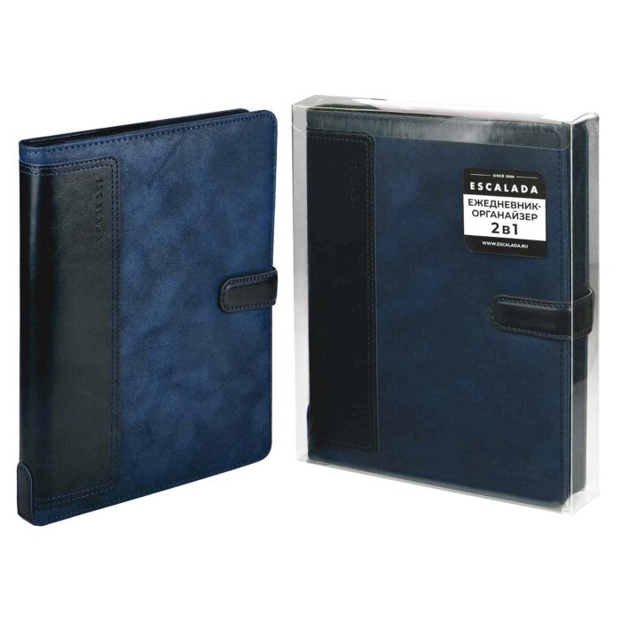 Ежедневник-органайзер недатированный ESCALADA, формат А5+ (170х225 мм), 160 л. Обложка: твёрдый переплёт с поролоном, аппликация из искусственной кожи, блинтовое тиснение, есть, скруглённый корешок, закруглённые углы обложки. Внутренний блок: ниткошвейный, кремовый офсет 70 г/м?, печать в одну краску (линия), закруглённые углы блока, нет, есть. Красочность форзаца: печать пантоном. Отделка среза: окрашивание пантоном. Закладка: два ляссе. есть. Особенности: внутренние карманы, магнитный клапан фигурный, папка-органайзер в твёрдом переплёте с поролоном, ежедневник в мягком переплёте, петля для ручки. Индивидуальная упаковка: подарочная картонная коробка с ПВХ-крышкой + промостикер + ПЭТ-пакет.
