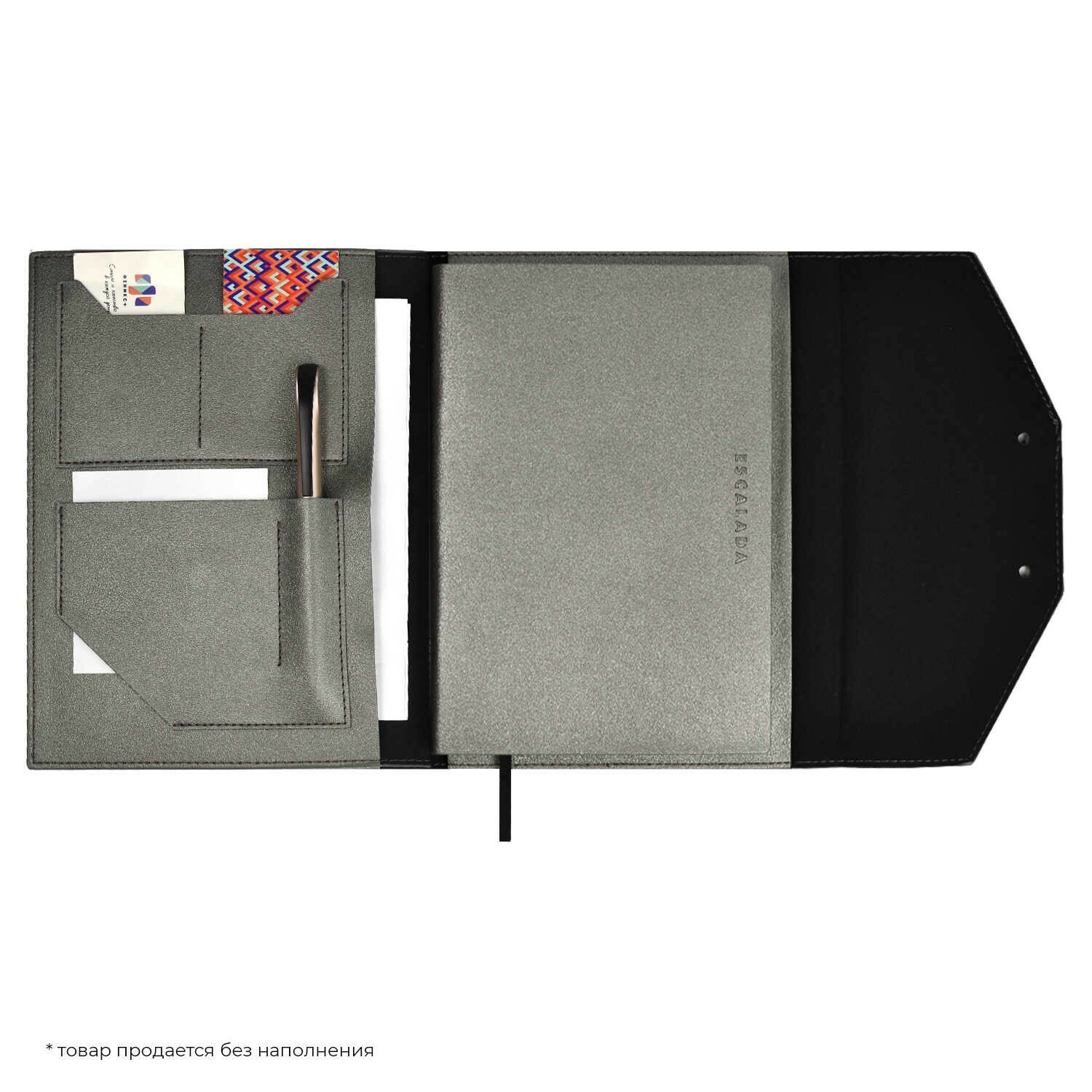 Ежедневник-органайзер недатированный ESCALADA, формат А5+ (165x220 мм), 120 л. Обложка: мягкий переплёт, запаянный край, блинтовое тиснение, есть, скруглённый корешок, прямые углы обложки. Внутренний блок: ниткошвейный, кремовый офсет 70 г/м?, печать в одну краску (линия), прямые углы блока, нет, есть. Красочность форзаца: печать пантоном, печать фольгой. Закладка: одно ляссе. есть. Особенности: застёжка "кобурные металлические кнопки", карманы для визиток и документов. Индивидуальная упаковка: подарочная картонная коробка с ПВХ-крышкой + промостикер + ПЭТ-пакет.