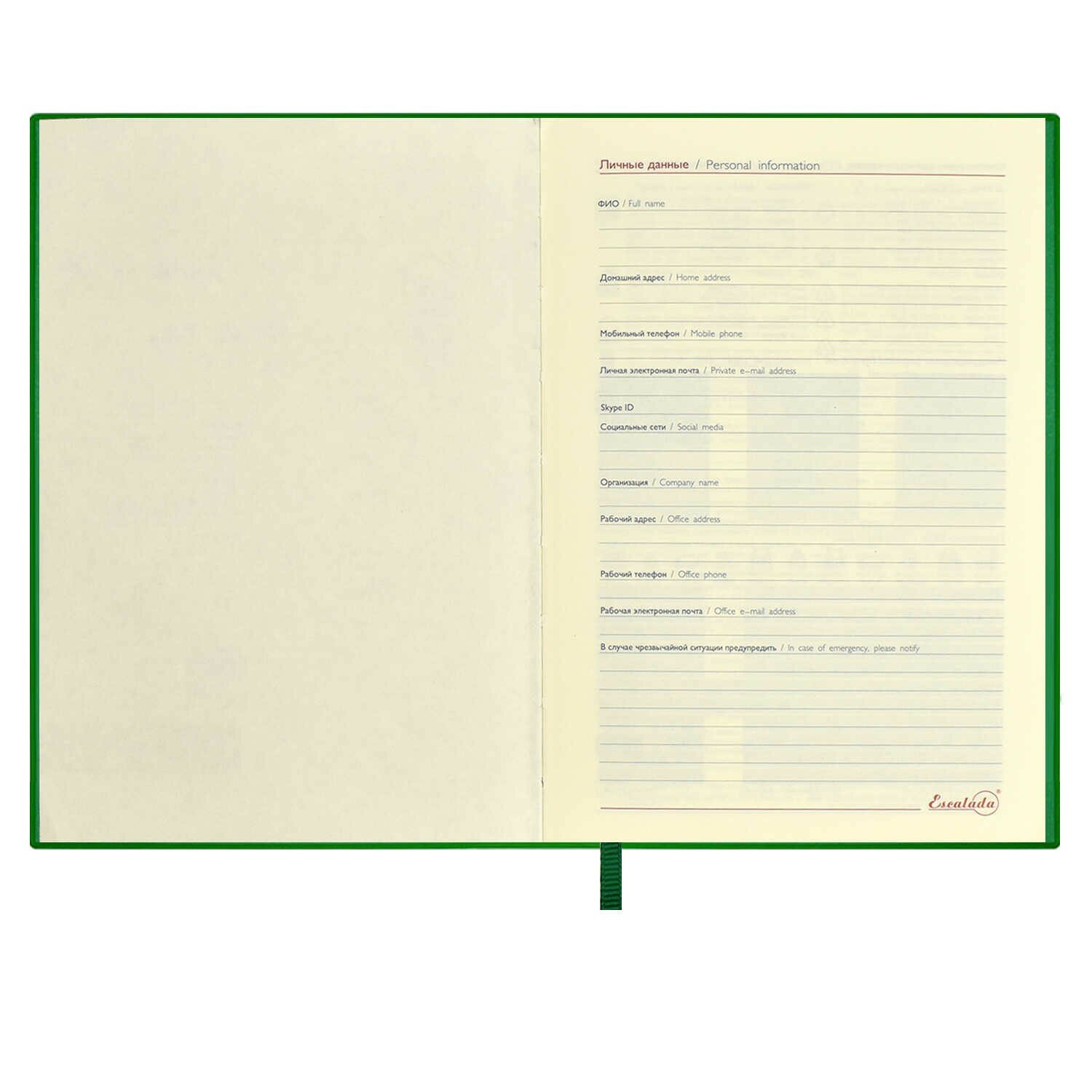 Ежедневник недатированный ESCALADA, формат А6+ (126х174 мм), 160 л. Обложка: мягкий переплёт, блинтовое тиснение, нет, скруглённый корешок, прямые углы обложки. Внутренний блок: ниткошвейный, тонированный офсет 70 г/м?, печать в две краски (линия), прямые углы блока, нет, есть. Красочность форзаца: печать пантоном. Отделка среза: окрашивание пантоном. Закладка: одно ляссе. есть. Индивидуальная упаковка: ПЭТ-пакет.