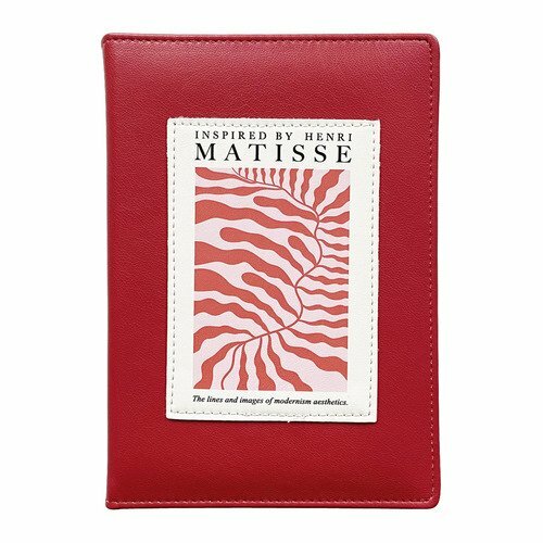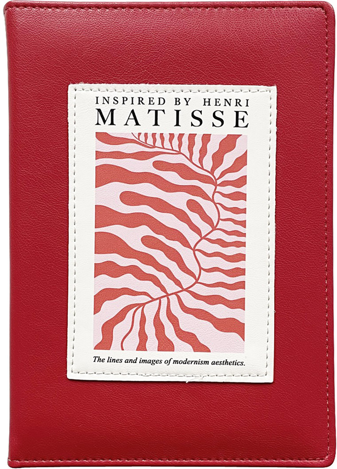Обложка: твердая с поролоном, нежная искусственная кожа, цвет - красный. Блок датированный, 352 стр., скругленные уголки, 2 ляссе, информационный блок, бумага: слоновая кость, 70 г/м2, печать 2+2, кармашек. Особенности: нашивка с печатью шелкографией фрагмента картины Анри Матисса, прострочка по периметру.