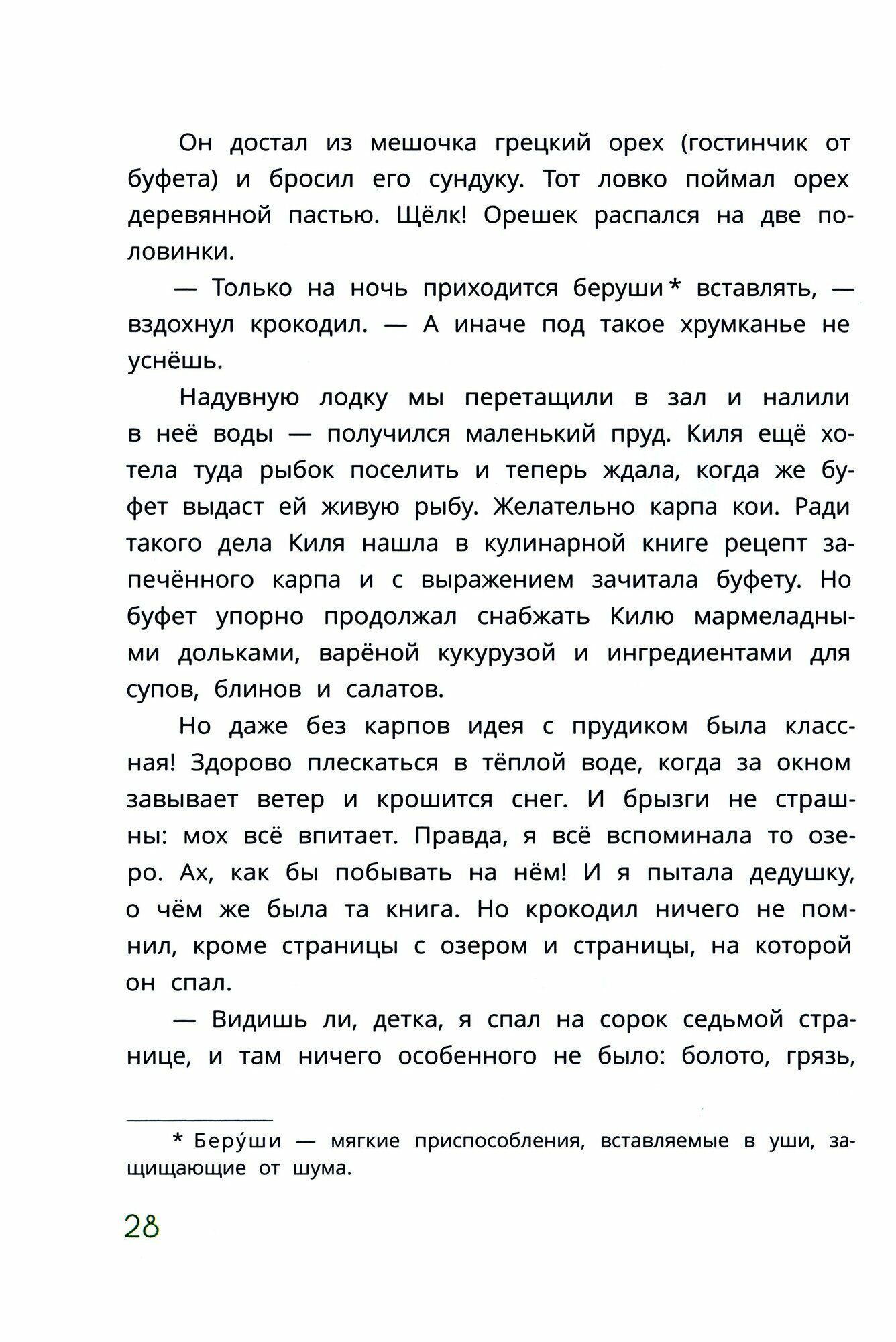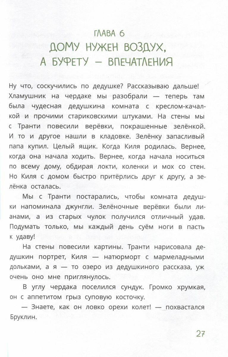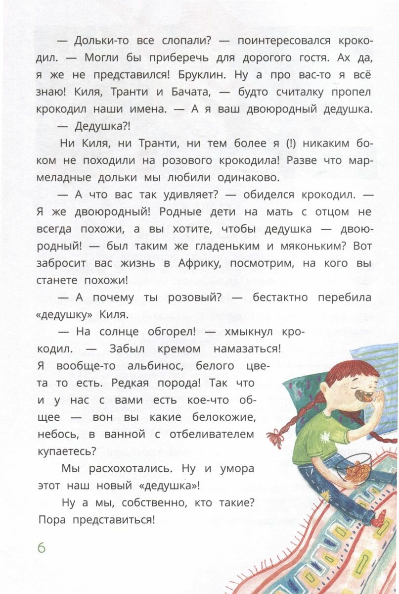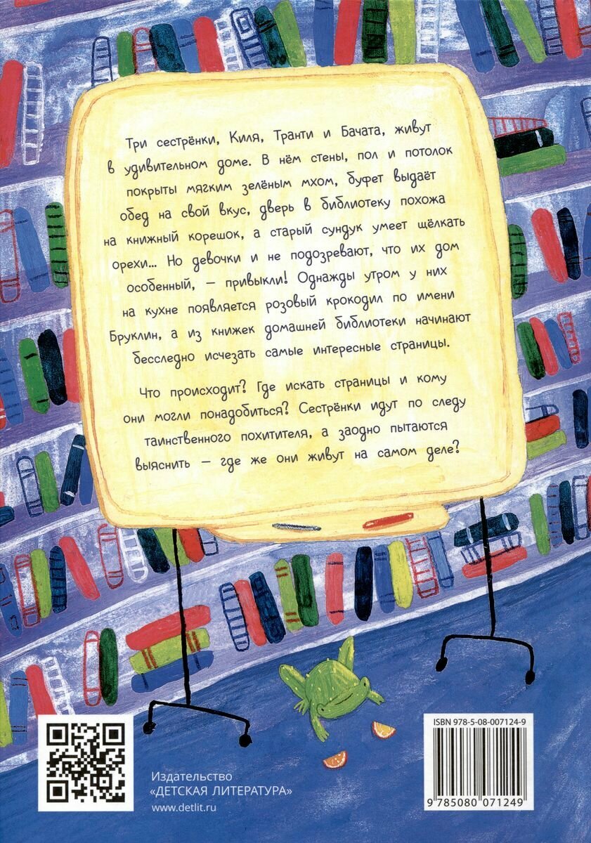 Три сестрёнки, Киля, Транти и Бачата, живут в удивительном доме. В нём стены, пол и потолок покрыты мягким зелёным мхом, буфет выдаёт обед на свой вкус, дверь в библиотеку похожа на книжный корешок, а старый сундук умеет щёлкать орехи… Но девочки и не подозревают, что их дом особенный, - привыкли! Однажды утром у них на кухне появляется розовый крокодил по имени Бруклин, а из книжек домашней библиотеки начинают бесследно исчезать самые интересные страницы.