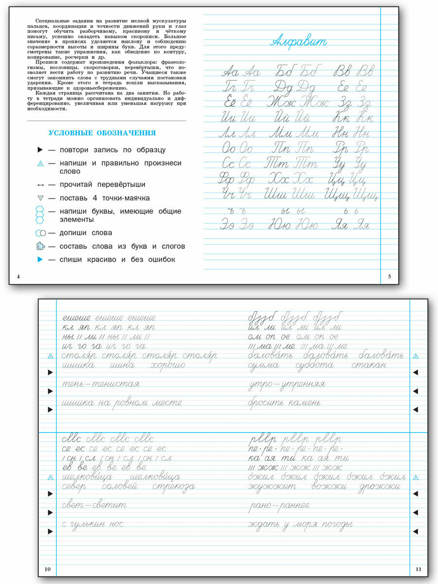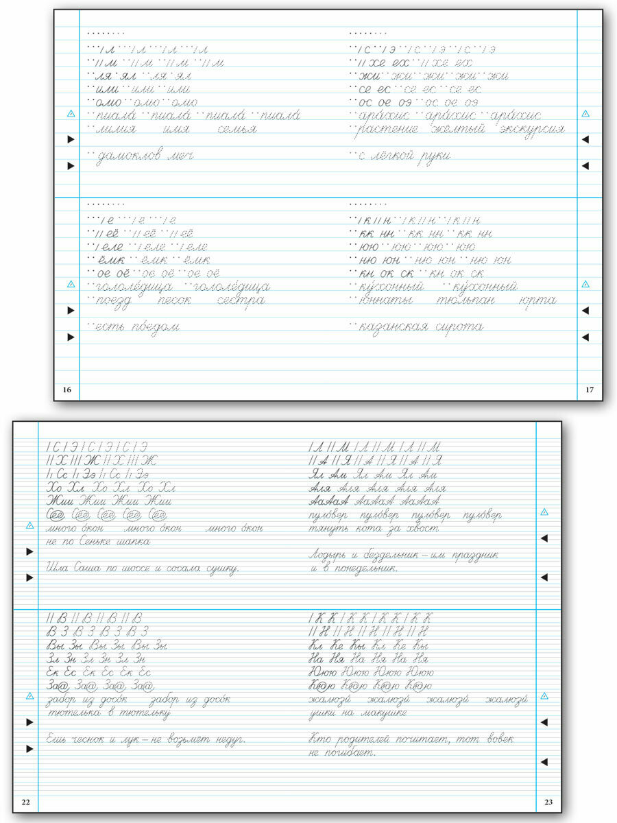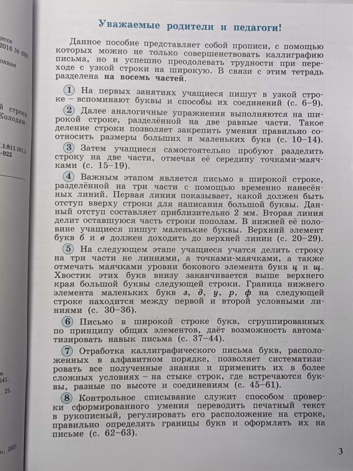 Данное пособие представляет собой прописи, с помощью которых можно не только совершенствовать каллиграфию письма, но и успешно преодолевать трудности при переходе с узкой строки на широкую. В связи с этим тетрадь разделена на восемь частей.