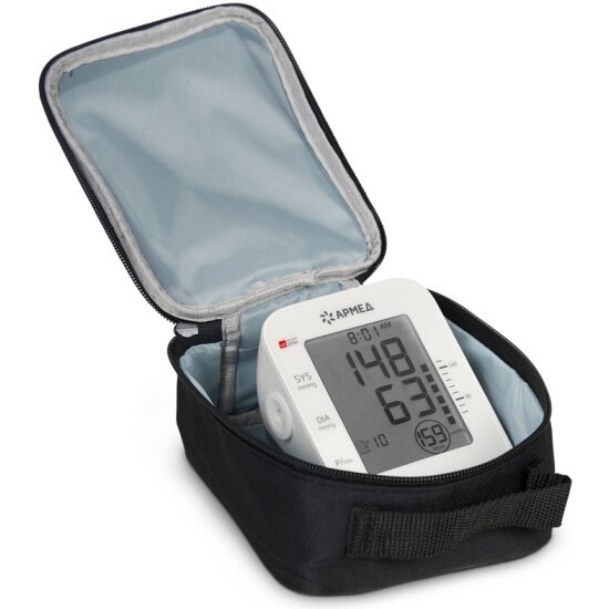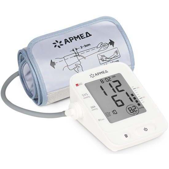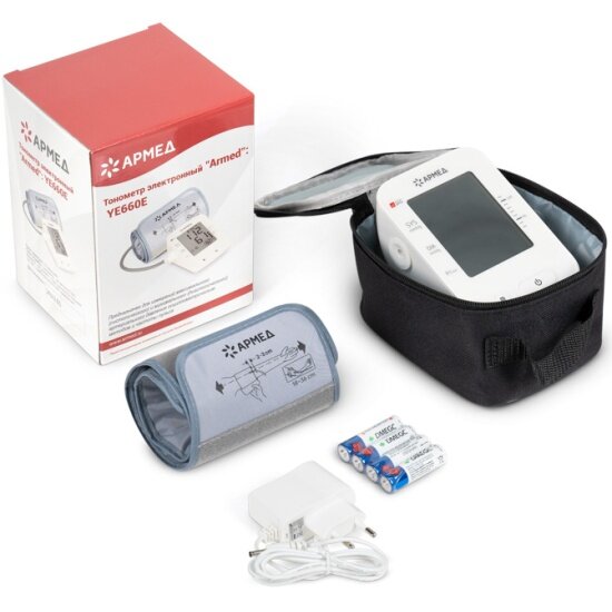 Тонометр Армед YE660E Манжета 360° Тонометр YE660E с манжетой на руку 18-36 см отлично подходит для измерения давления у пациентов небольшой комплекции. Инновационная манжета 360° легко крепится на руке и обеспечивает плавный набор давления и комфортное измерение. YE660E - простой и функциональный прибор для бытового и профессионального применения с удобным управлением, понятным даже пожилым людям. Речевой выход Функция речевого выхода поможет пользоваться прибором слабовидящим пользователям. Приятный женский голос на русском языке поможет подготовиться к измерению и озвучит результаты. Манжета 360 градусов Тонометр комплектуется инновационной манжетой 360°, которая может измерять давление по всей окружности руки без привязки к расположению. Подходит на руки с окружностью 18-36 см. Работа от сети или батареек Тонометр может работать как от сети, так и от батареек, поэтому прибор можно брать в дорогу. Удобное хранение Тонометр поставляется в сумке-чехле на молнии: так прибор удобнее хранить и брать в поездки. Среднее значение Тонометр автоматически рассчитывает среднее значение по результатам последних трёх измерений, что позволяет проводить мониторинг состояния здоровья.