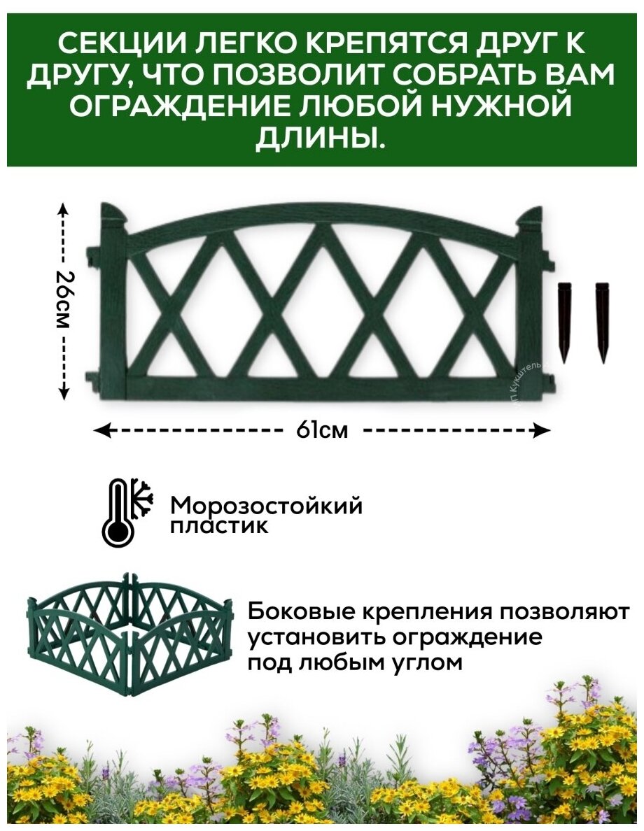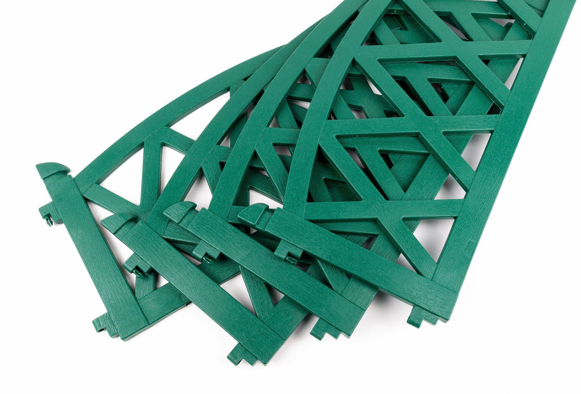Мастер Сад Арка - красивое и практичное ограждение для клумб, выполненное в классическом стиле. Конструкция состоит из нескольких элементов, собирающихся в забор длиной 2,4 м и высотой 26 см. Темно-зеленый оттенок гармонично сочетается с зеленью сада, газоном.
