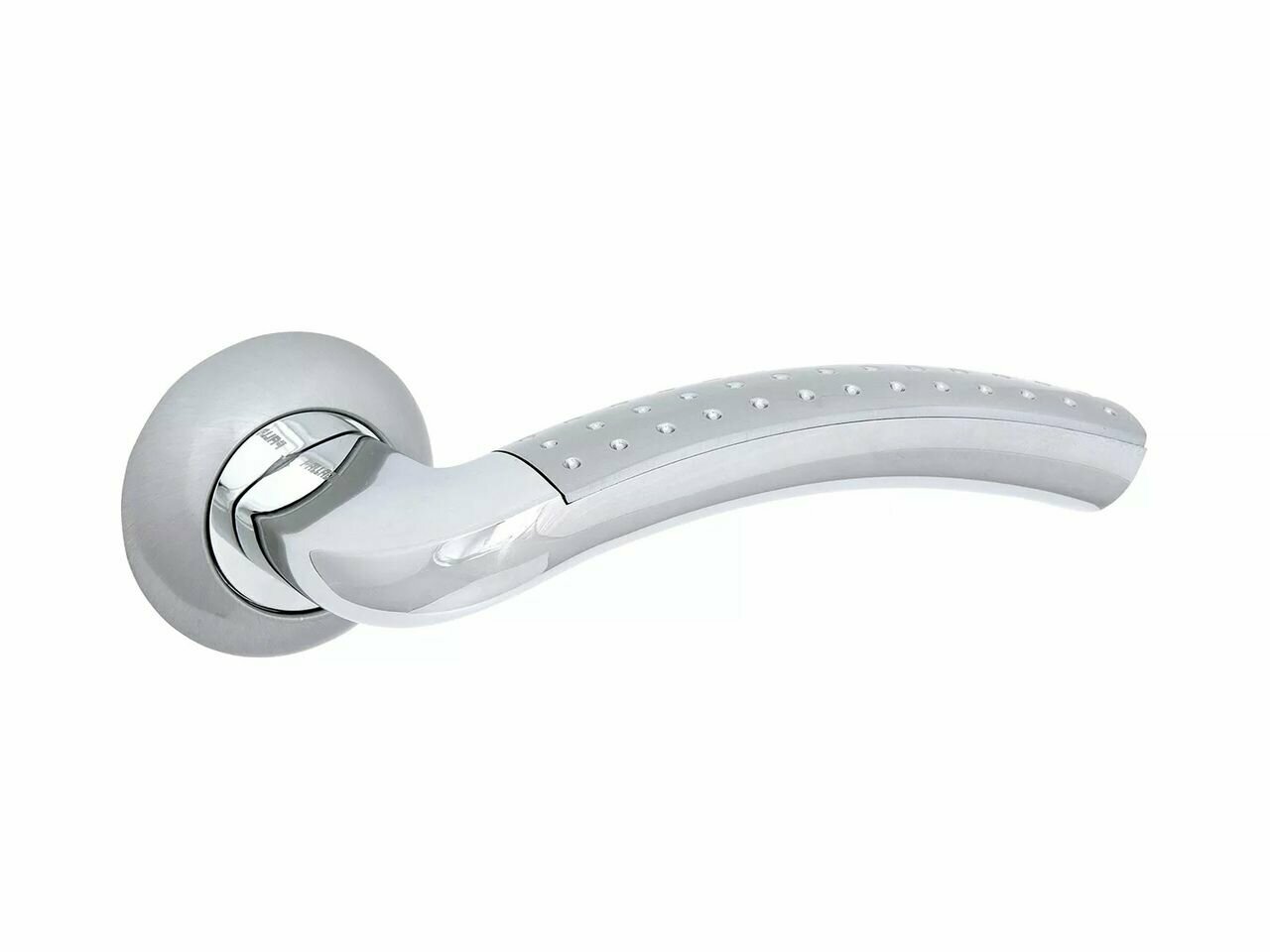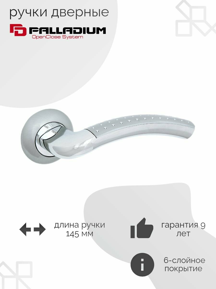 Palladium Velasca AB – дверная ручка с для межкомнатных и входных дверей. Материал изготовления ЦАМ, покрытие гальваника и два слоя защитного лака. Стойкость к коррозии: 96 ч на тестах в соляном тумане. Не менее 200 000 циклов открывания-закрывания механизма. В комплекте: дверные ручки (2 шт.), квадрат 8x8 мм, шестигранный ключ, шурупы (6 шт.), стяжные винты (2 шт.).