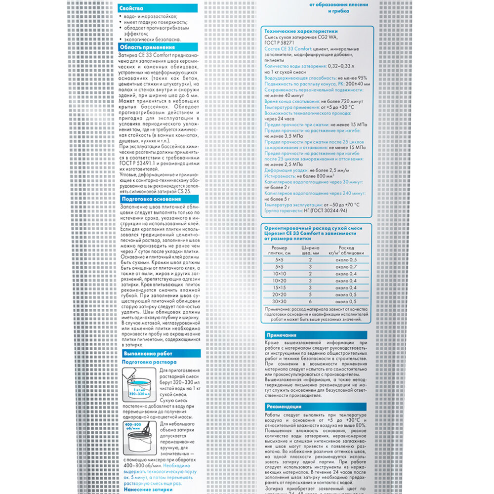 Затирка цементная Ceresit СЕ 33 Comfort используется для заполнения межплиточных швов шириной до шести миллиметров, придает облицованной поверхности эстетичный вид, продлевает срок службы покрытия, подходит для эксплуатации в условиях периодического увлажнения. Из сухой смеси готовится пластичный, удобный для нанесения раствор с противогрибковой защитой. Серебристо-серый оттенок проявляется в течение двух суток после нанесения.