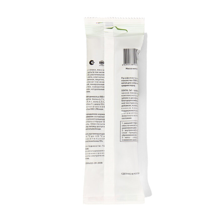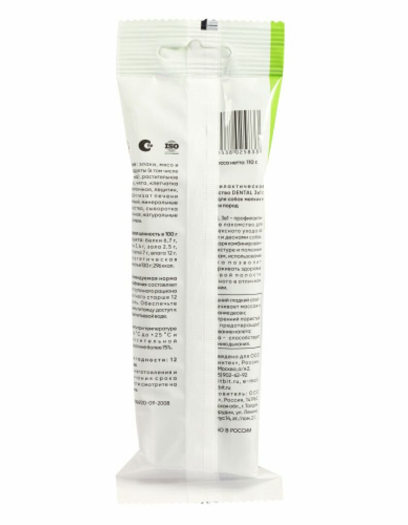 DENTAL 3в1 - профилактическое лакомство для комплексного ухода за зубами и деснами собак. Благодаря комбинированной текстуре и полезным добавкам использование снека позволит поддерживать здоровье ротовой полости животного в отличном состоянии: 1 - внешний гладкий слой - обеспечивает массаж и укрепление десен; 2 - внутренний пористый слой - предотвращает образование налета; 3 - мята - способствует освежению дыхания.