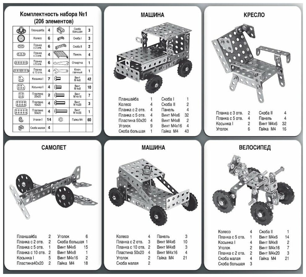 Конструктор №1 для уроков труда является лидером продаж в своей серии. Он изначально создавался для занятий в начальных классах средней школы и дошкольных образовательных учреждениях, привязан к формату школьного часа. Несмотря на относительно небольшое количество элементов — 206 деталей, из него можно собрать 4 конструкции средней сложности. При его разработке учитывались все требования Минобрнауки РФ (тогда Министерства образования), а невысокая цена делает конструктор №1 абсолютным лидером продаж среди других металлических конструкторов для уроков труда.