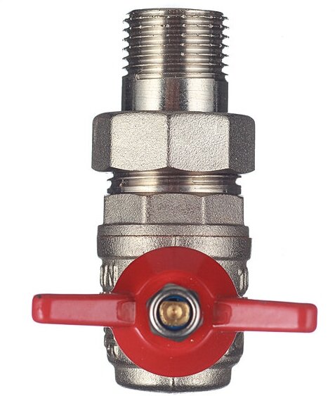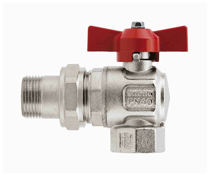 Угловой полнопроходной ремонтопригодный шаровый кран с увеличенным ресурсом, 1/2 . Соединен накидной гайкой с резьбовым полусгоном. Корпуса деталей - латунные, никелированные. Кран оснащен ручкой типа бабочка с утолщенной стенкой из алюминиевого сплава и эпоксидным покрытием красного цвета. Резьба присоединений – внутренняя/наружная.