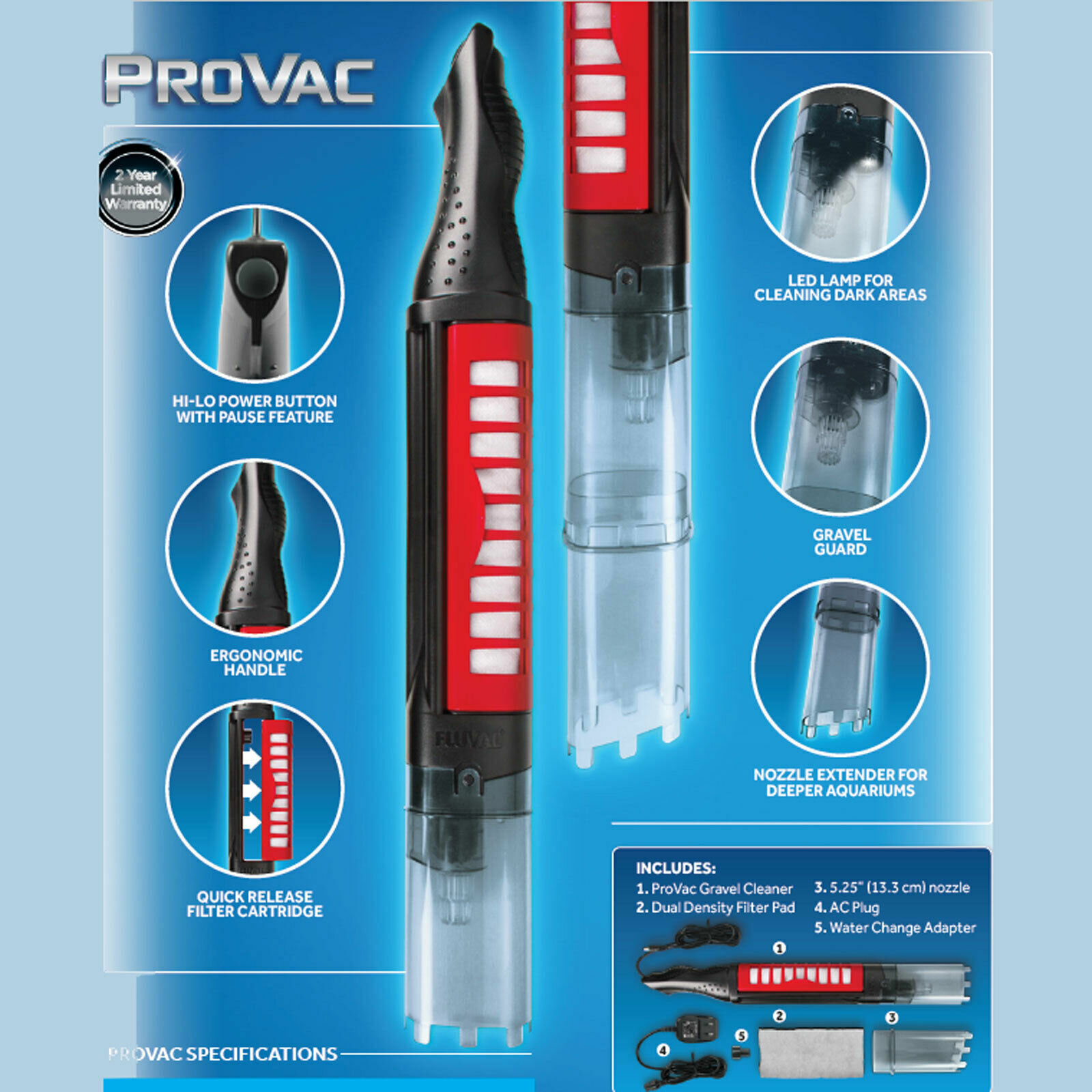 Новинка известного от немецкого бренда Hagen! Электрический сифон для чистки грунтового слоя от органических осаждений поможет очистить аквариум с высотой стенок до 60 см. Функции и особенности применения сифона: Механизм работы сифона прост и понятен. Для начала забора воды, сифон FLUVAL ProVac помещается под воду и запускается. Основная очистка происходит под водой по принципу “пылесоса”. Вода проходит сквозь внутреннюю колбу и фильтрующий контейнер, поступая в аквариум уже очищенной. На корпусе сифона есть LED индикатор. При работе возможно некоторое замутнение воды, это связано с конвекцией органической взвеси и осадков. Такая органическая муть быстро осаждается в фильтре. Прочные и долговечные элементы, из которых изготовлен сифон, будут служить долгое время. Состоит сифон из трубки, колбы с сеточкой и фильтрующим картриджем для задерживания мусора внутри и насадки на колбу с “зубцами” для более эффективного втягивания грунтовых осаждений. Сифон имеет две скорости работы. Подключается к электросети при помощи кабеля и блока питания (входят в комплект). При необходимости, к сифону крепится шланг (входит в комплект) для слива воды в отдельную емкость. Можно использовать сифон в любых аквариумах (пресных и морских). Очищенный грунтовый слой поможет поддержать химический баланс водной среды в равновесии.
