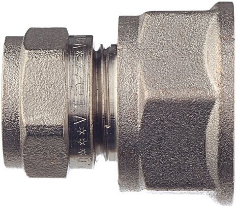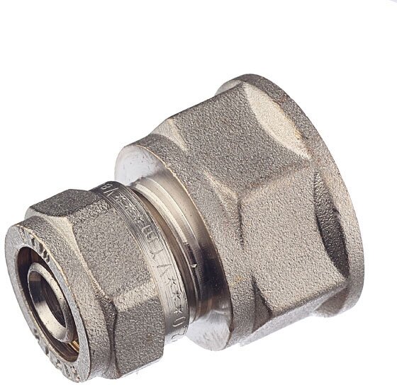 Двухсторонний прямой латунный никелированный фитинг для соединения металлополимерной трубы и компонента системы с резьбовым подключением. Резьба фитинга - внутренняя трубная по ГОСТу 6357, 16 х 3/4