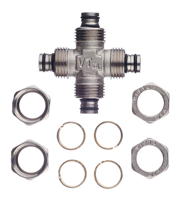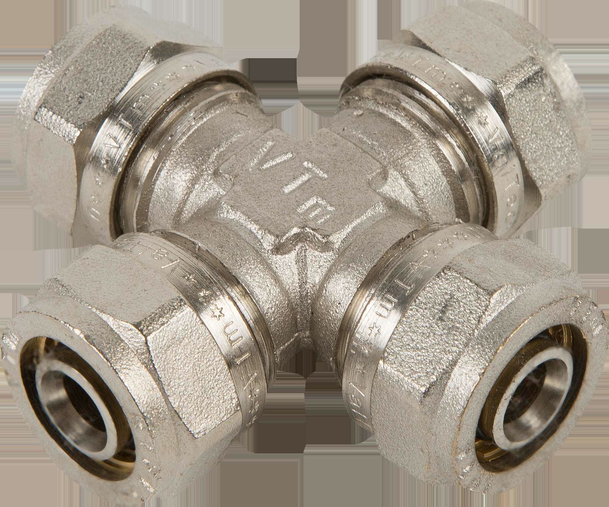 Латунный никелированный фитинг для соединения четырех металлополимерных труб (крестовина). Имеются равнопроходные модели и модели с разными диаметрами пересекающихся трубопроводов. Cерия VTm.341.N
