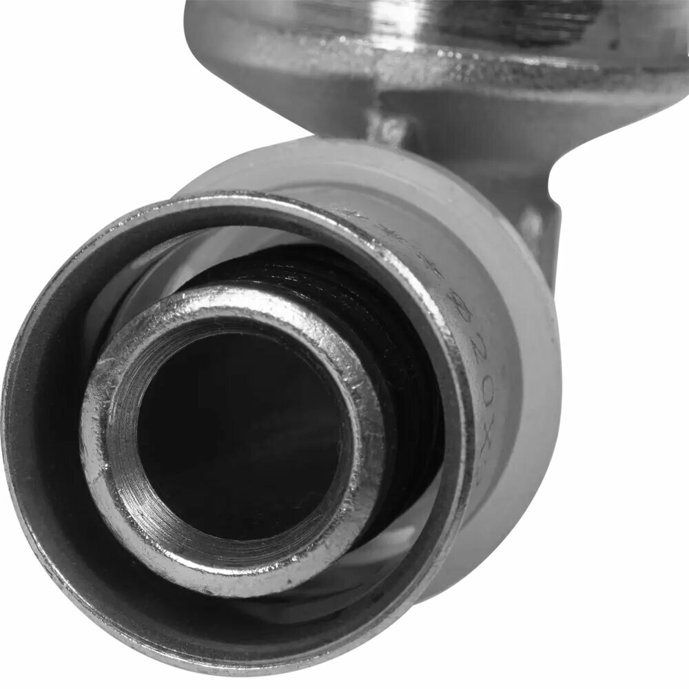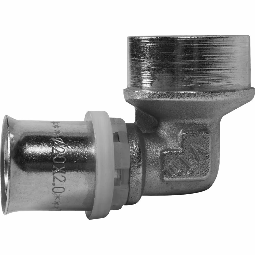 Угловой пресс - фитинг для подсоединения к металлопластиковым трубам (металлополимерные трубы) компонента системы с резьбовым подключением. Материал - сантехническая латунь, 20 х 3/4