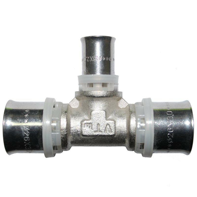 Пресс - фитинг для соединения трех металлополимерных труб (металлопластиковых труб). Модельный ряд включает в себя равнопроходные и переходные (с выходами разного диаметра) модели. 20 х 16 х 20. Cерия VTm.231.N