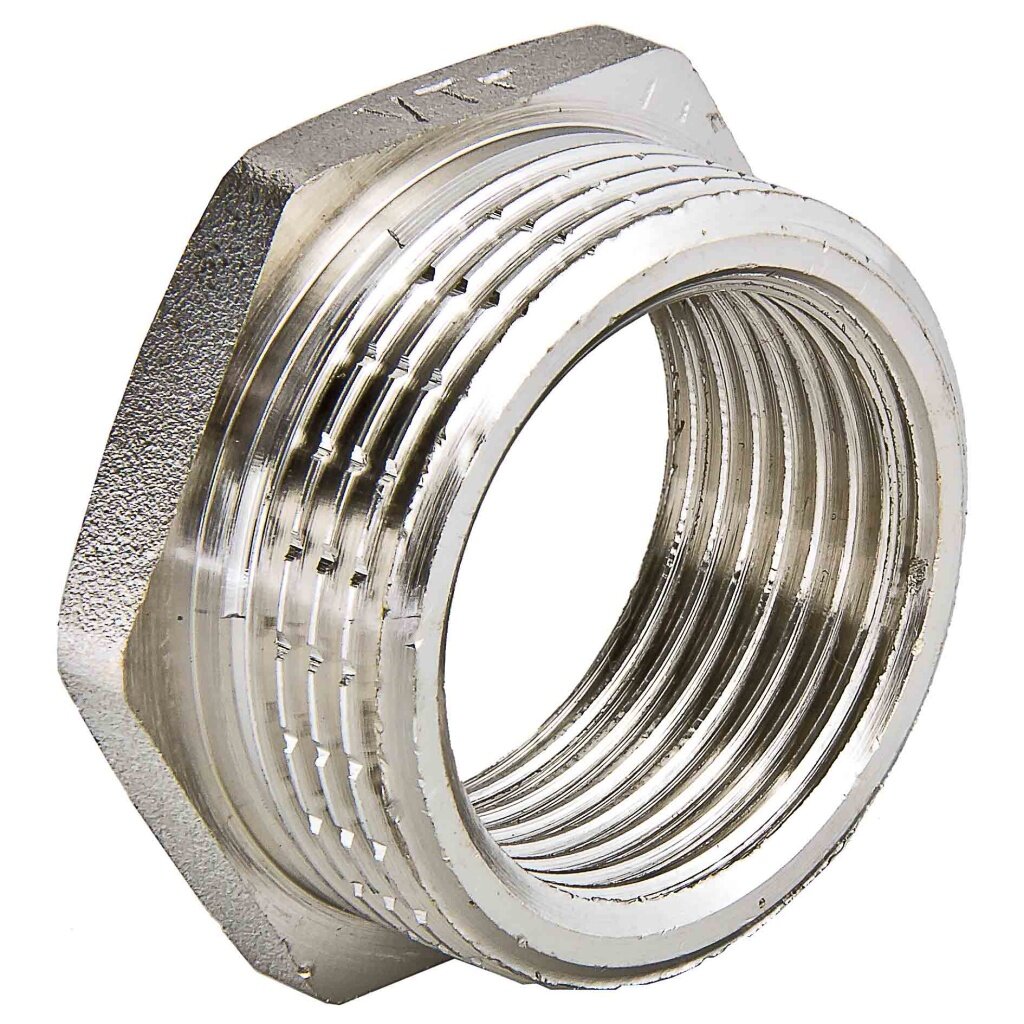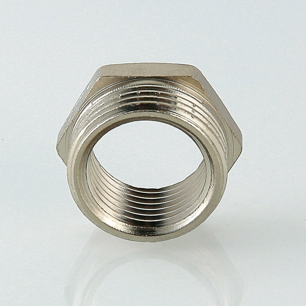 Латунный никелированный фитинг, обеспечивающий переход трубопровода с одного диаметра на другой (футорка). Имеет наружную и внутреннюю трубную цилиндрическую резьбу, 1 1/4 х 1/2 , по ГОСТу 6357 (ISO 228, EN 10226).