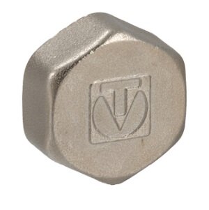 Латунная никелированная трубопроводная заглушка с шестигранной головкой, 3/4 . Имеет внутреннюю трубную цилиндрическую резьбу по ГОСТу 6357 (ISO 228, EN 10226), совместимую также с наружной конической трубной резьбой по ГОСТу 6211 (ISO R7). Cерия VTr.590.N