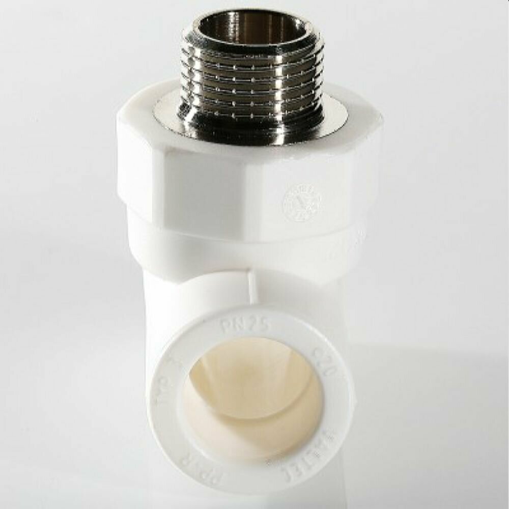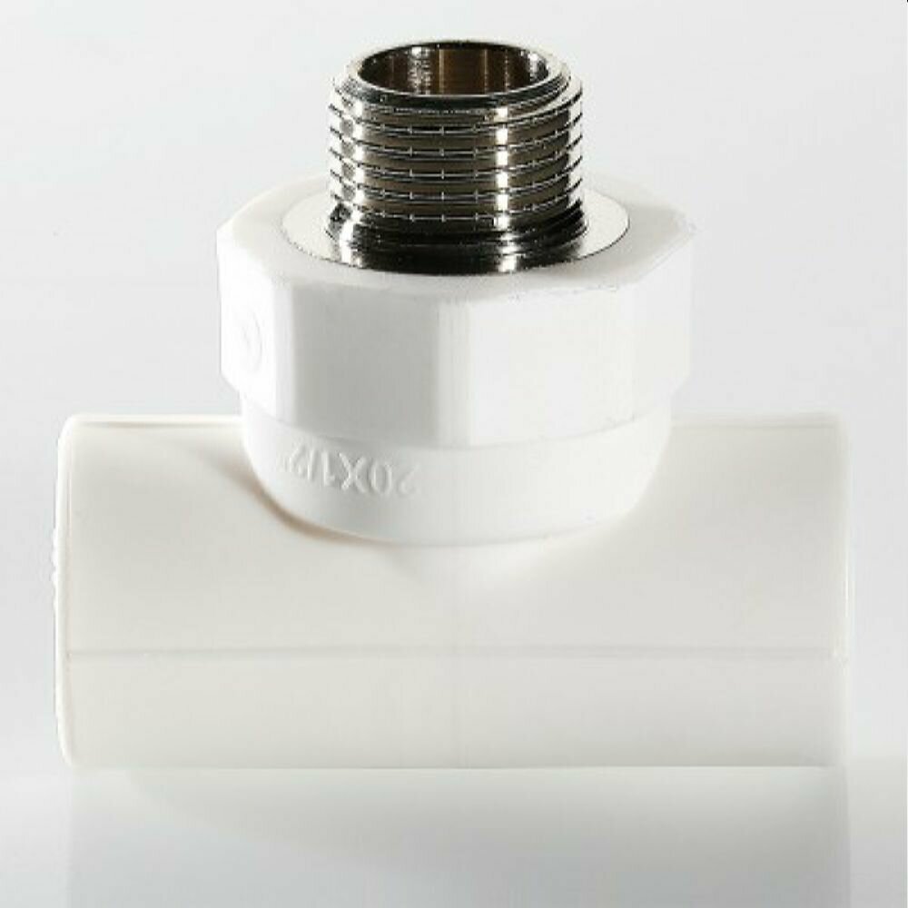 Трехсторонний металлопластиковый фитинг для подсоединения к полипропиленовому трубопроводу компонента инженерной системы с резьбовым подключением. Резьба фитинга - наружная трубная, 20 х 1/2 , по ГОСТу 6357.