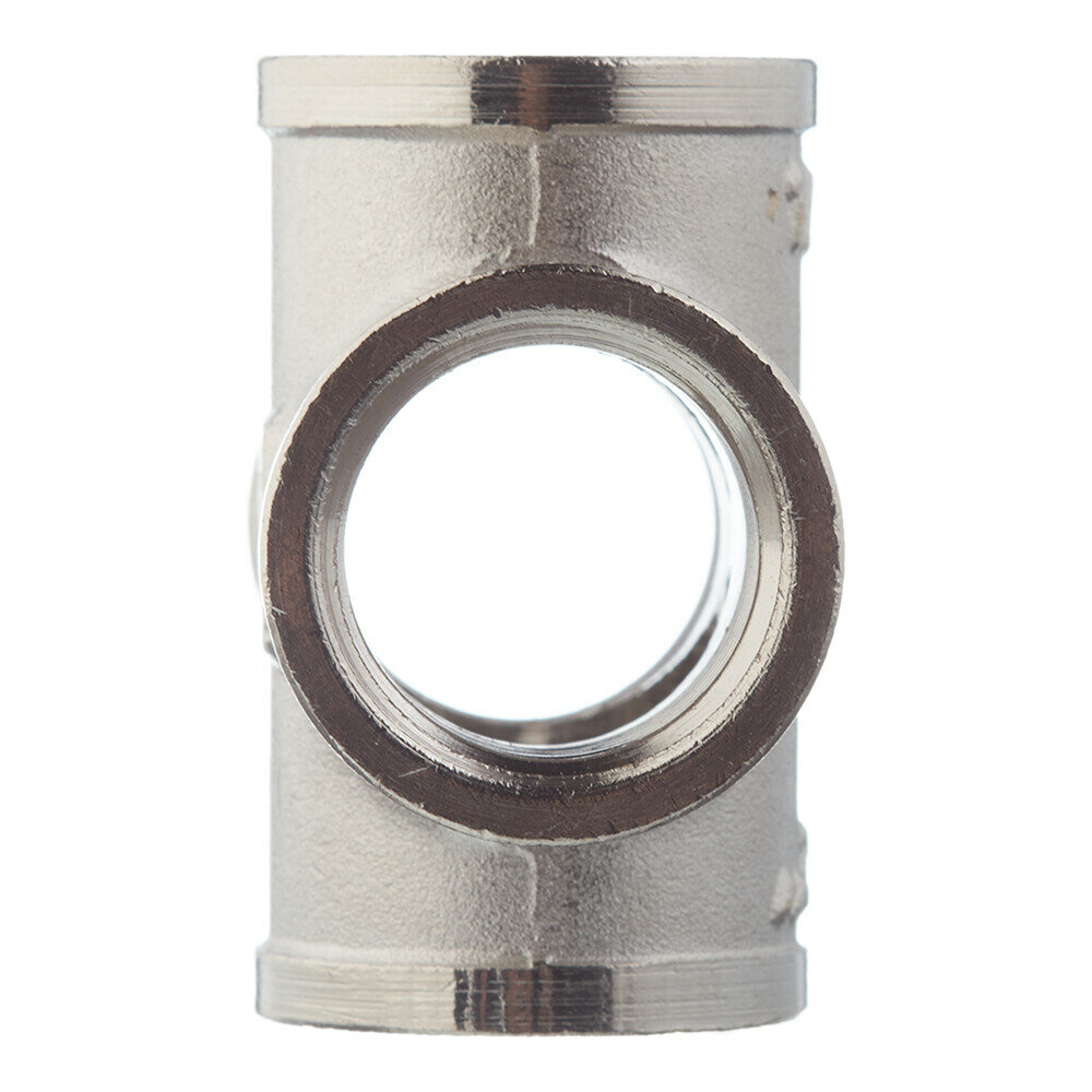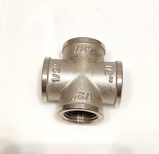 Латунный никелированный четырехсторонний фитинг, равнопроходной. Резьба – внутренняя, цилиндрическая трубная по ГОСТу 6357 (ISO 228, EN 10226), совместимая также с наружной конической трубной резьбой по ГОСТу 6211 (ISO R7).