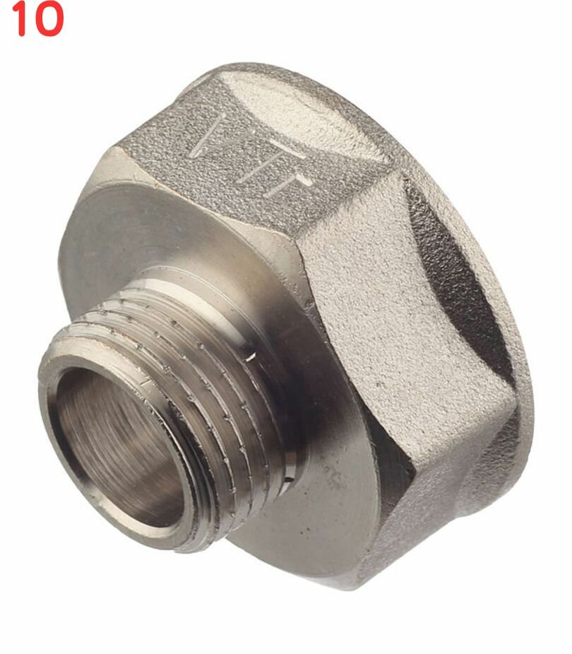 Назначение фитинга – переход с внутренней резьбы на наружную (больший/меньший диаметр). Переходник изготовлен горячим штампованием из латуни CW617N с последующим никелированием. Корпус фитинга – шестигранный – под гаечный ключ. Резьба – трубная цилиндрическая, совместимая с наружной конической по ГОСТу 6211. Номинальное давление – 40/25 бар (для типоразмеров до/более 1”). Максимальное рабочее давление при температуре среды 250 градусов Цельсия – 2,7/1,7 бара. Переходник применим на стальных, медных, латунных, пластиковых, металлопластиковых трубопроводах.