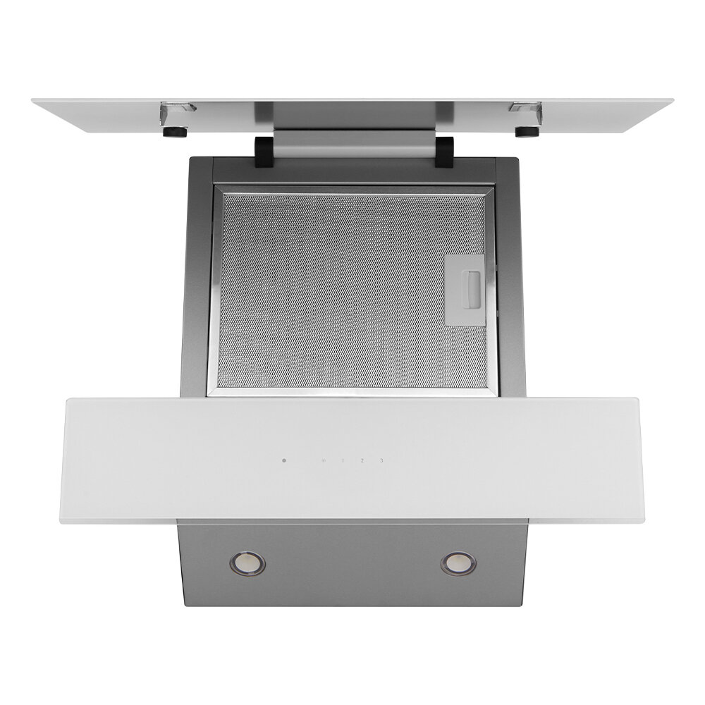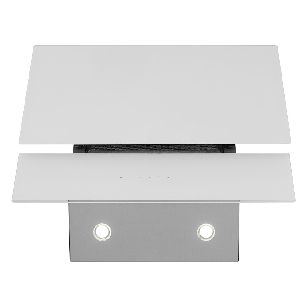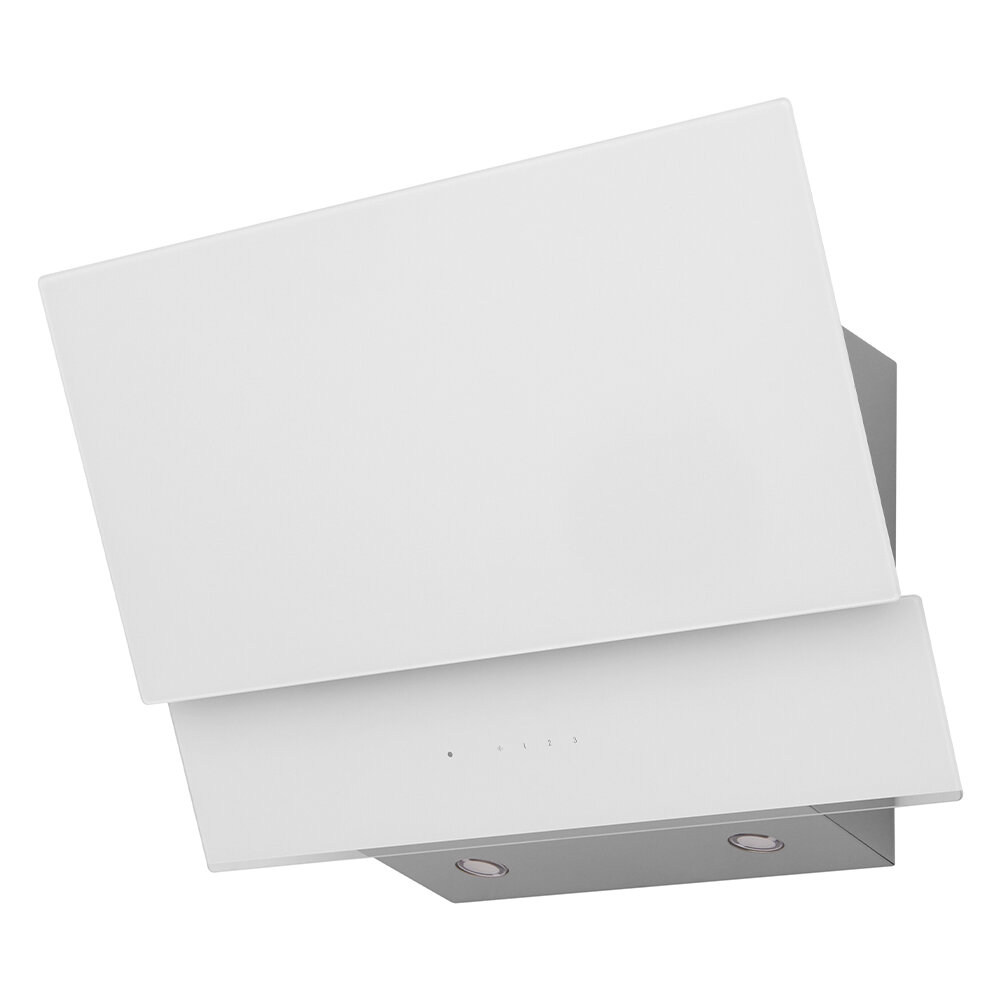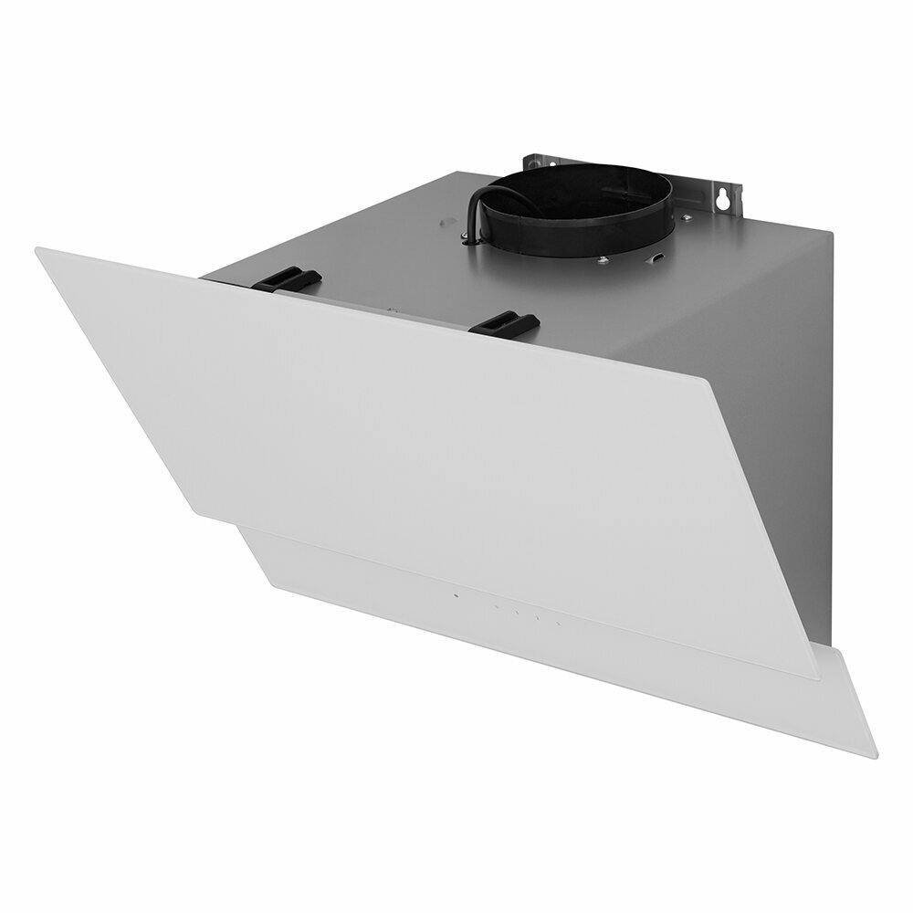 Эта настенная вытяжка изготовлена из качественного белого стекла, что делает ее идеальным дополнением для любого интерьера кухни. Размеры модели составляют: высота 36,3-103 см, ширина 60 см и глубина 42,5 см, что обеспечивает удобство установки и использования. В комплектацию входят два декоративных короба, а также жироулавливающие и обратные клапаны, которые обеспечивают эффективную очистку воздуха.