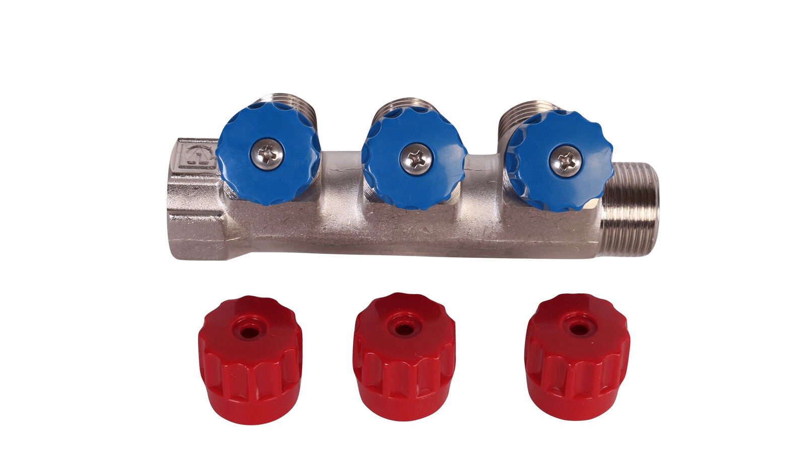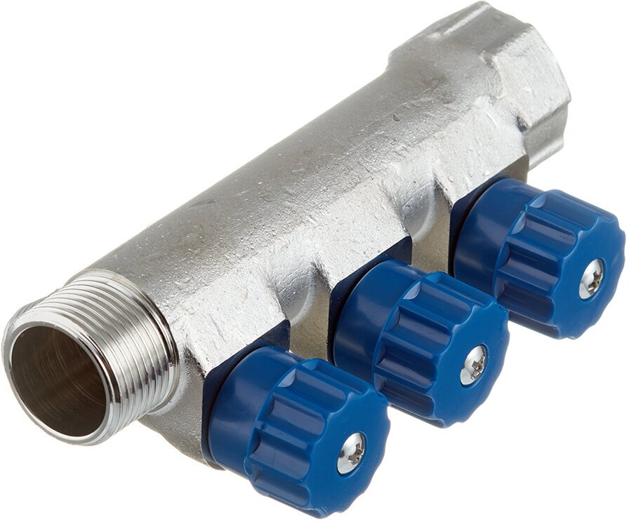 Латунный никелированный коллектор на 3 выхода диаметром 1/2 с наружной резьбой. На каждом выходе предусмотрен вентиль для регулирования расхода рабочей среды со средним полным ресурсом 8 тыс. циклов. Применяется для распределения потоков жидкостей в контурах теплого пола, радиаторного отопления, холодного и горячего водоснабжения.