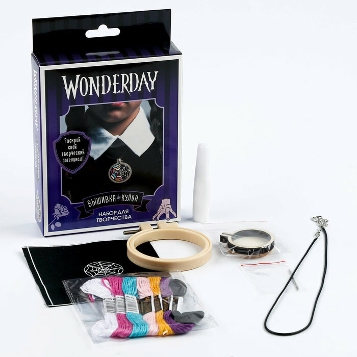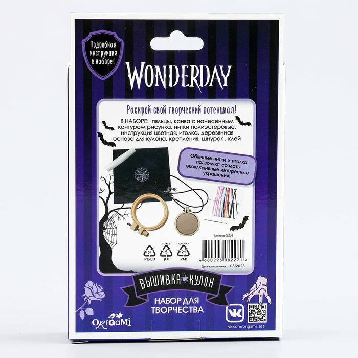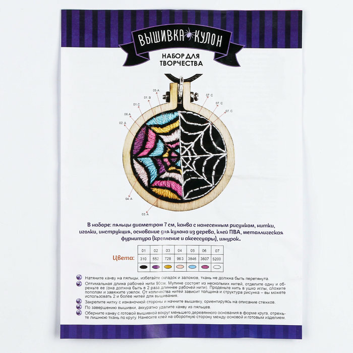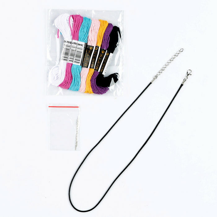 | Комплектация | пяльцы диаметром 7 см, канва с нанесенным рисунком, нитки, игла, основа для кулона из дерева,шнур, металлическая фурнитура, клей, инструкция. |