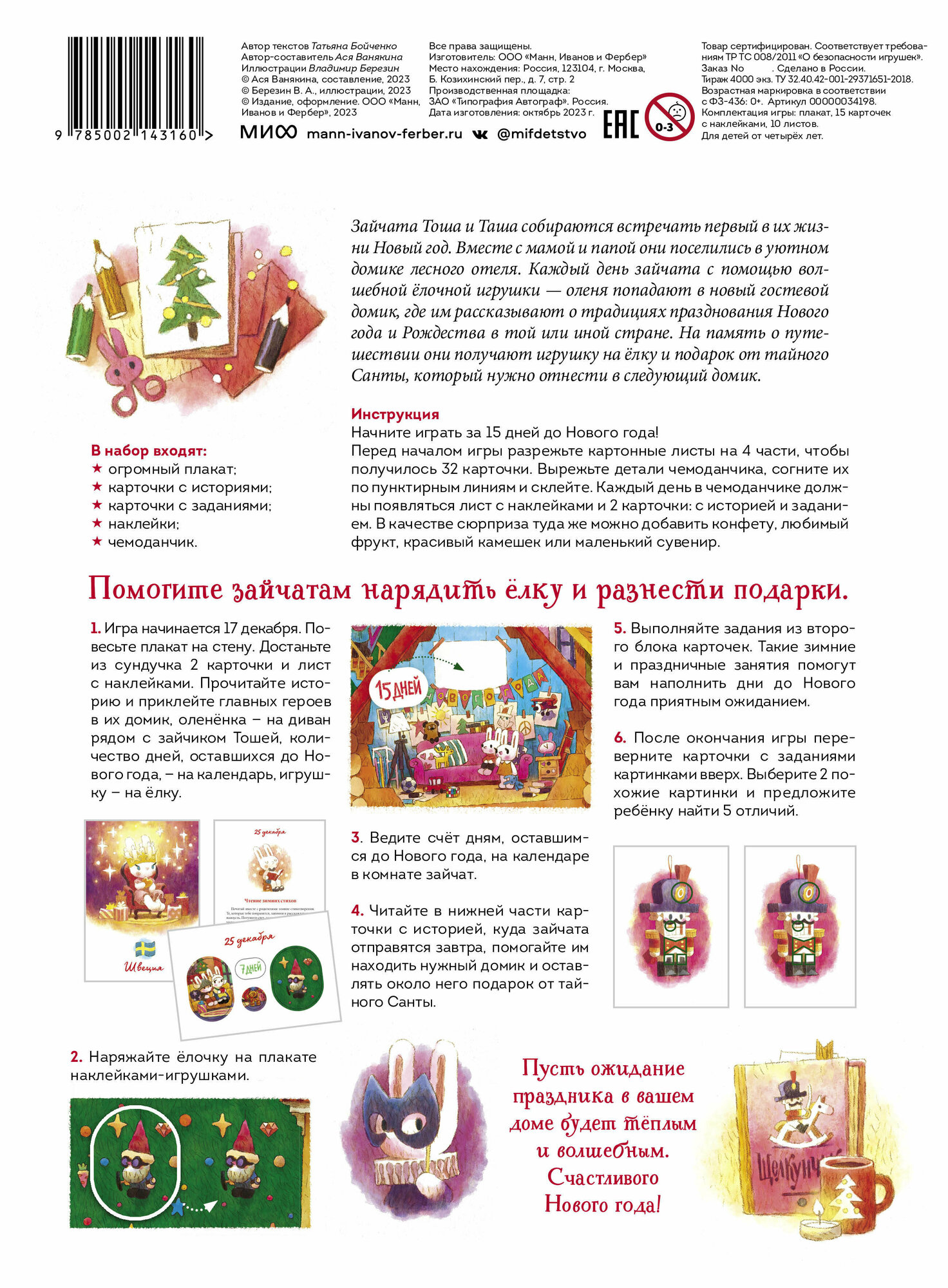Чтобы ожидание Нового года не было грустным и утомительным, проведите 15 дней уходящего года вместе с увлекательным и уютным адвентом.Семья зайчиков решила встретить Новый год в домике лесного отеля, куда съехались их друзья из разных стран. Зайчатам Тоше и Таше выпало быть почтальонами тайного Санты. Каждый день они оказываются в новом домике иностранного гостя, дарят ему подарок и слушают историю о том, как встречают Новый год или Рождество в его стране.Состав адвента:огромный плакат, который украсит стену в комнате;15 листов с наклейками;16 карточек с историей;16 карточек с заданиями;чемоданчик, в который каждый день надо класть по две карточки, лист с наклейками и маленький сувенир по желанию;игра "Найди отличия".Инструкция:Начните играть за 15 дней до Нового года!Перед началом игры разрежьте картонные листы на четыре части, чтобы получилось 32 карточки. Вырежьте детали чемоданчика, согните их по пунктирным линиям и склейте. Каждый день в чемоданчике должны появляться лист с наклейками и две карточки: с историей и с заданием. В качестве сюрприза туда же можно добавить конфету, любимый фрукт, красивый камешек или маленький сувенир.Помогите зайчатам нарядить ёлку и разнести подарки.Игра начинается 17 декабря. Повесьте плакат на стену. Достаньте из чемоданчика две карточки и лист с наклейками. Прочитайте историю и приклейте главных героев в их домик, оленёнка — на диван рядом с зайчиком Тошей, количество дней, оставшихся до Нового года, — на календарь, игрушку — на ёлку.Наряжайте ёлочку на плакате наклейками-игрушками.Ведите счёт дням, оставшимся до Нового года, на календаре в комнате зайчат.Читайте в нижней части карточки с историей, куда зайчата отправится завтра, и помогайте им находить нужный домик и оставлять около него подарок от Тайного Санты.Выполняйте задания из второго блока карточек. Такие зимние и праздничные занятия помогут вам наполнить дни до Нового года приятным ожиданием.После окончания игры переверните карточки с заданиями картинками вверх. Выберите две похожие картинки и предложите ребёнку найти пять отличий.Для кого этот адвент-календарь:Для детей от 4 лет и их родителей.
