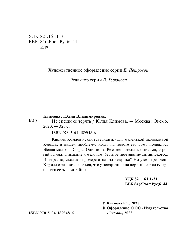 Книга: Не спеши ее терять (Климова Юлия Владимировна); ООО "Издательство "Эксмо", 2023