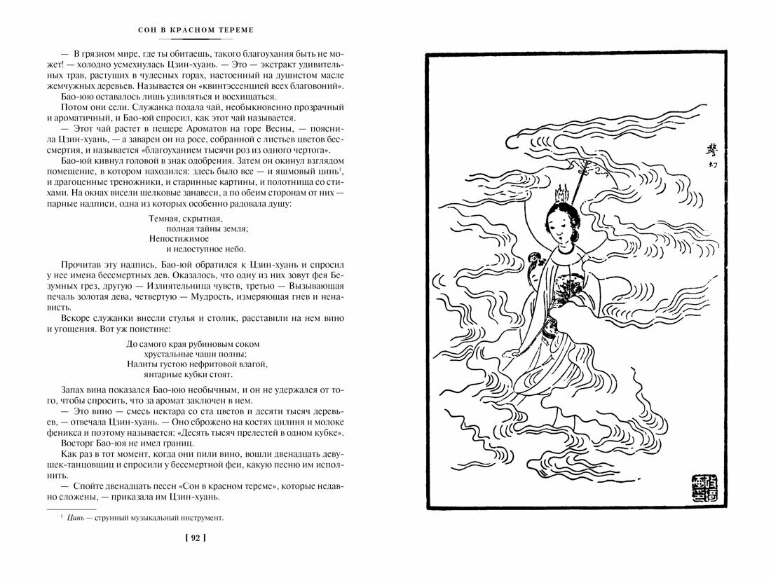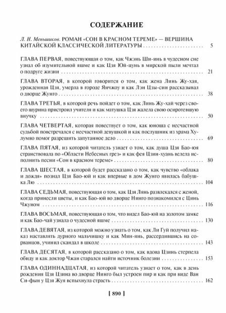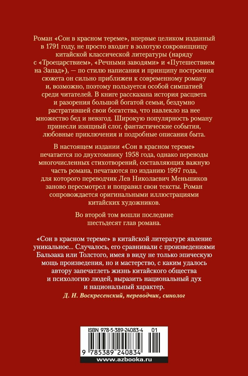 Роман «Сон в красном тереме», впервые целиком изданный в 1791 году, не просто входит в золотую сокровищницу китайской классической литературы (наряду с «Троецарствием», «Речными заводями» и «Путешествием на Запад»), — по стилю написания и принципу построения сюжета он сильно приближен к современному роману и, возможно, поэтому пользуется особой симпатией среди читателей. В книге рассказана история расцвета и разорения большой богатой семьи, бездумно растратившей свои богатства, что навлекло на нее множество бед и невзгод. Широкую популярность роману принесли изящный слог, фантастические события, любовные приключения и подробные описания быта.