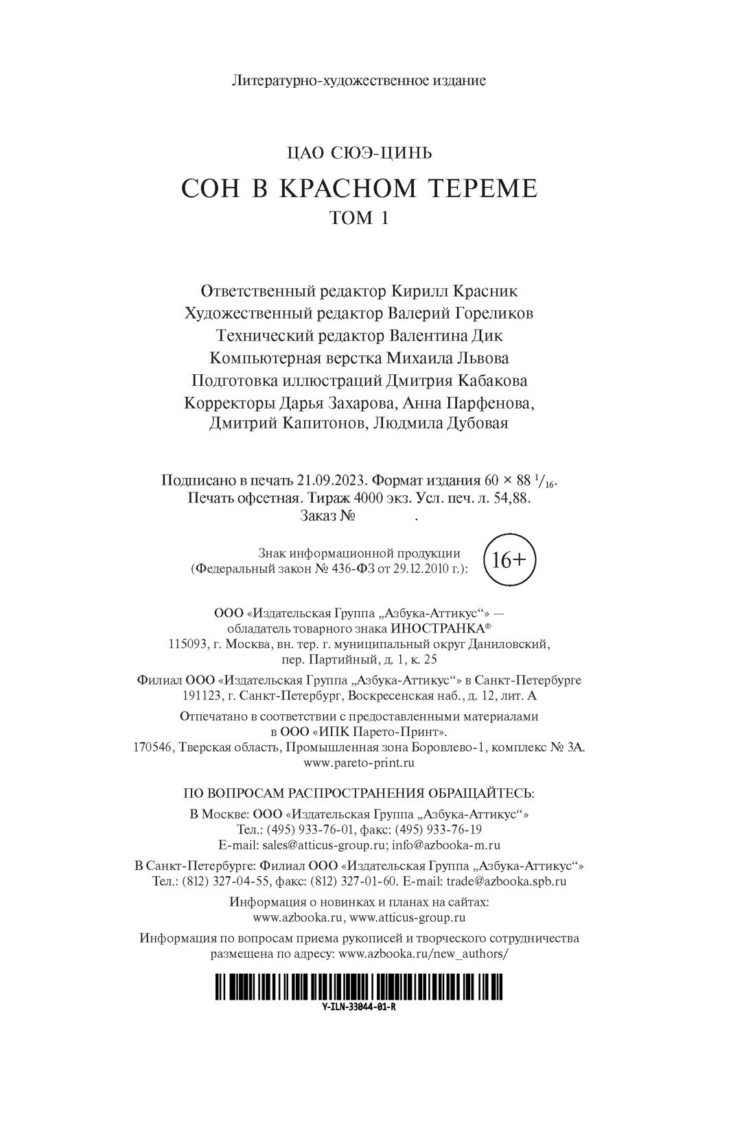 В настоящем издании «Сон в красном тереме» печатается по двухтомнику 1958 года, однако переводы многочисленных стихотворений, составляющих важную часть романа, печатаются по изданию 1997 года, для которого переводчик Лев Николаевич Меньшиков заново пересмотрел и поправил свои тексты. Роман сопровождается оригинальными иллюстрациями китайских художников.