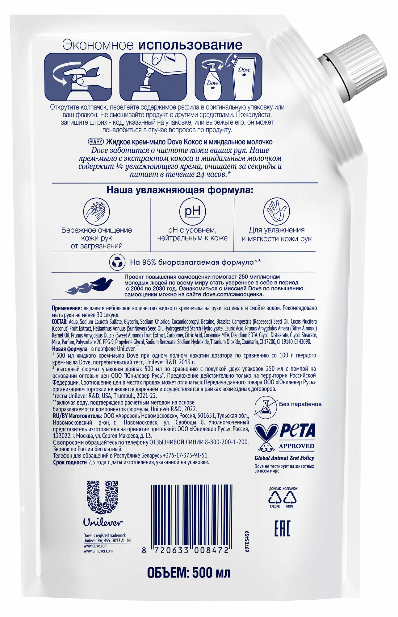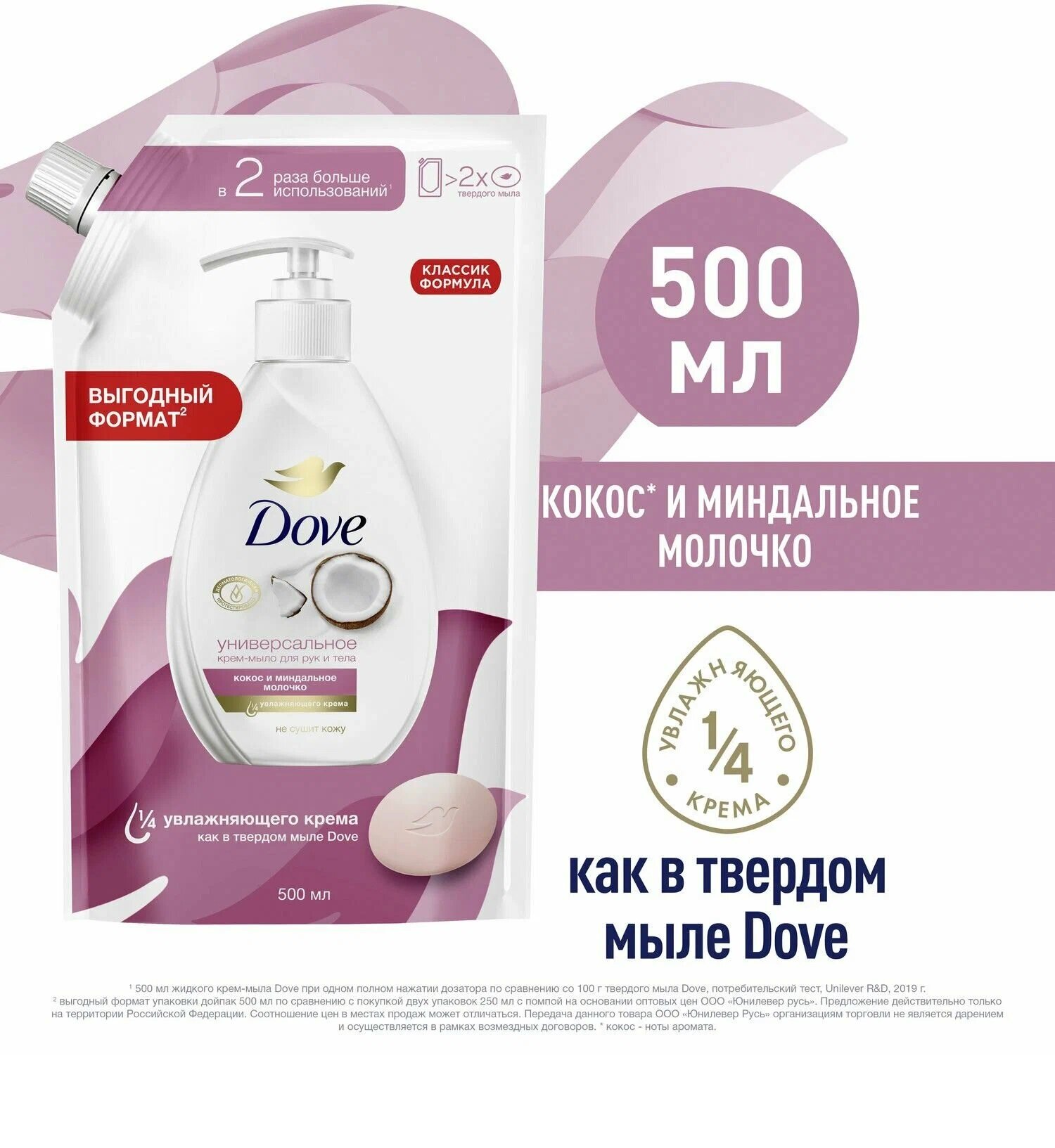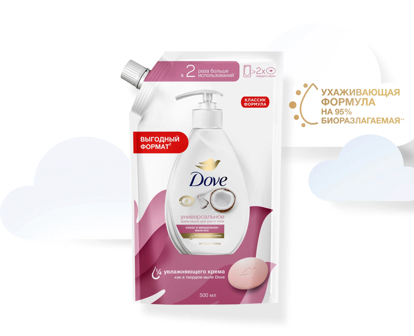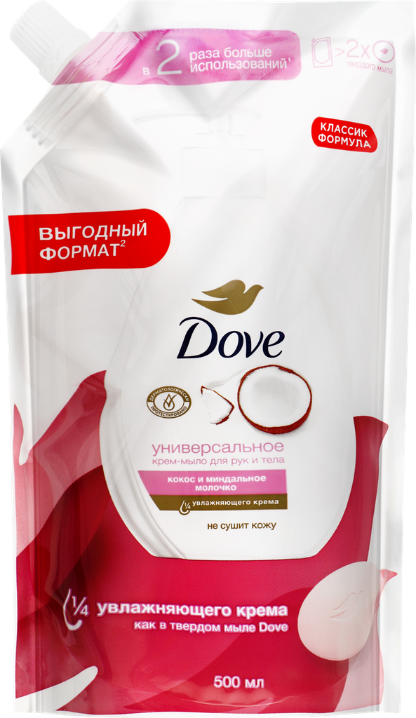 Жидкое крем-мыло Dove Кокос и миндальное молочко: бережный уход и увлажнение.Мягкое очищение и питание. Крем-мыло Dove Кокос и миндальное молочко на ¼ состоит из увлажняющего крема, обеспечивая бережное и качественное очищение кожи рук от загрязнений. Формула мыла на 95% биоразлагаема, что делает его отличным выбором для регулярного мытья рук.Ощущение увлажнения и мягкости кожи. Увлажняющая формула мыла Dove гарантирует ощущение увлажнения и мягкости кожи рук после каждого применения.Приятный аромат и упаковка. Жидкое крем-мыло Dove имеет приятный уходовый аромат кокоса и миндаля, который оставляет на коже нежный шлейф. Упаковка дойпак удобна для хранения и использования, а также позволяет перелить мыло в диспенсер.Подходит для всех типов кожи. Крем-мыло Dove подходит для ежедневного применения и подходит для всех типов кожи.Dove заботится об окружающей среде. Жидкое крем-мыло Dove Кокос и миндальное молочко производится с использованием на 83% меньше пластика, чем обычный флакон.Повышение самооценки и раскрытие внутреннего потенциала. Dove заботится об окружающей среде и вносит свой вклад в повышение самооценки и раскрытие внутреннего потенциала следующего поколения женщин.Выгода и подарок. Получите 50% крем-мыла Dove Кокос и миндальное молочко в подарок при покупке комплекта из двух упаковок объемом 500 мл.