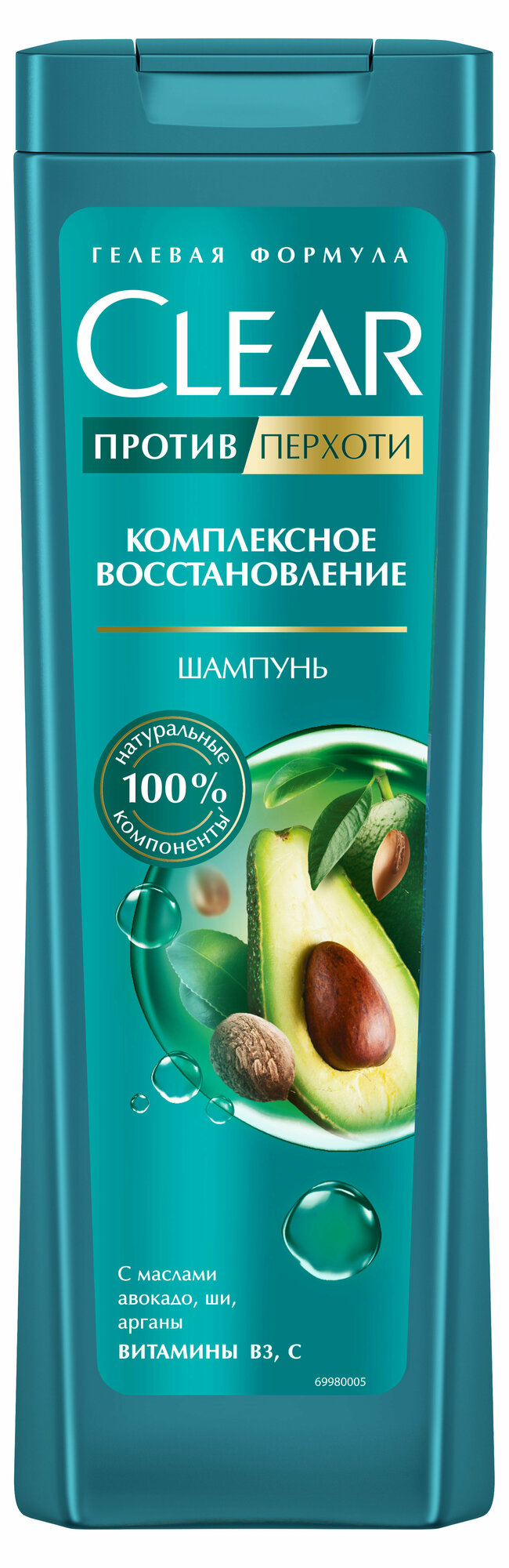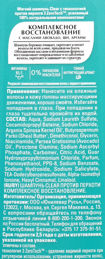 Шампунь Clear Комплексное восстановление против перхоти – инновационное средство на основе технологии против перхоти 3 ZeroTech эффективно и нежно очищает волосы, питает и укрепляет их по всей длине, а также защищает структуру от повреждений.Уникальная формула шампуня содержит 100% натуральные компоненты, такие как масла авокадо, ши и арганы, а также витамины B3, которые способствуют восстановлению и укреплению поврежденных и ослабленных волос.Благодаря своей гелевой текстуре, шампунь Clear отлично пенится и легко распределяется по волосам, оставляя после мытья тонкий интригующий аромат.