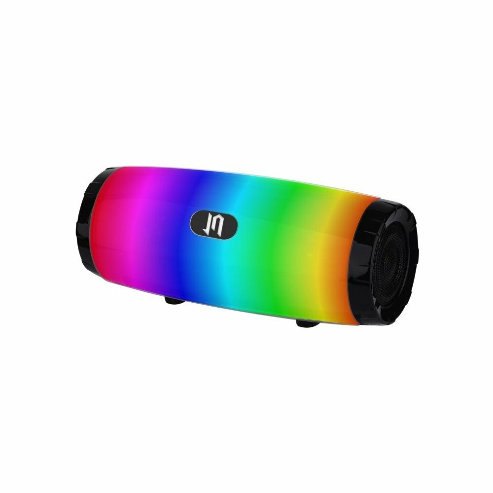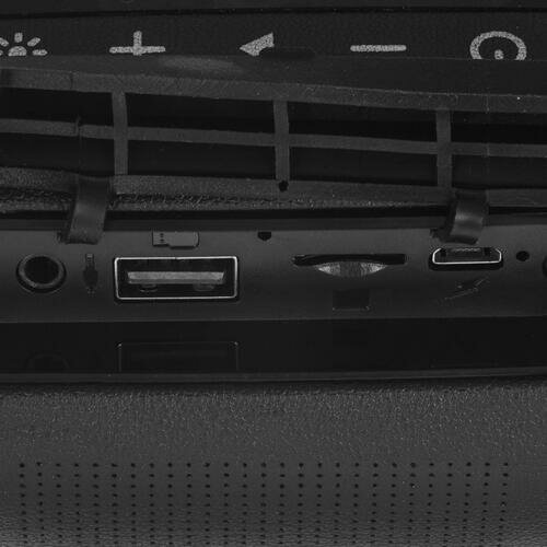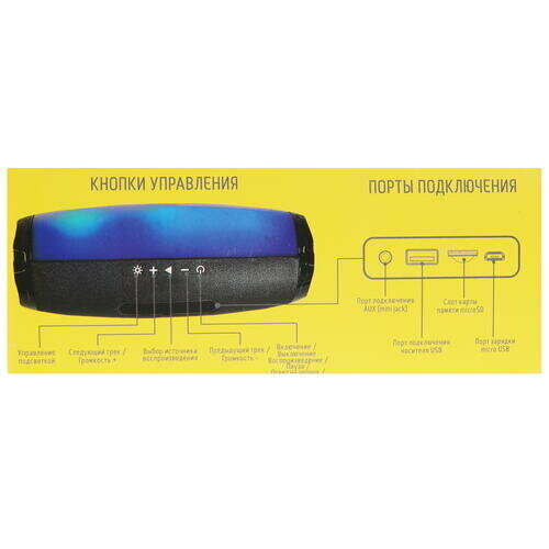 Bluetooth 5.0 При помощи Bluetooth соединения вы можете подключить колонку к любому мобильному устройству (телефону, планшету, ПК или ноутбуку), оснащенному bluetooth-модулем. Версия Bluetooth 5.0 обеспечивает низкое энергопотребление, уверенный прием сигнала в радиусе до 10 м и ускоренную передачу данных, а также минимизирует возможные помехи от соседних bluetooth-устройств. LED-подсветка Подсветка работает в 8 различных режимах однотонного и разноцветного свечения. В одном из режимов подсветка будет переливаться в такт играющей музыке. Подсветку можно полностью отключить. Поддержка режима TWS Режим TWS (True Wireless System) позволяет объединить две колонки в одну полноценную 2.0-стереосистему. Одна колонка становится правой, а вторая — левой, то есть на каждой колонке воспроизводится только свой канал, что создает дополнительный объем звучания. AUX Подключить колонку к мобильному телефону, планшету, плееру можно посредством кабеля AUX (mini jack (male)/ mini jack (male)). FM-радио Для надежного приема радиосигнала необходимо подключить кабель AUX, в этом режиме он выполнит функцию антенны. USB и Micro SD Для воспроизведения любимых аудиозаписей можно просто подключить к колонке USB-флешку или карту памяти microSD. Носители должны быть отформатированы в файловой системе FAT32 и иметь объем не более 32 Гб. Время работы Емкость аккумулятора колонки составляет 1200 mAh. При уровне громкости ~50% и включенной подсветке полного заряда аккумулятора хватит примерно на 5,5 часов прослушивания музыки. Если подсветка выключена - на срок до 7,5 часов. Низкая температура окружающей среды и высокая громкость могут способствовать сокращению времени работы. Защита от брызг IPX4 Случайное кратковременное попадание брызг воды не сможет повредить колонку, но необходимо беречь колонку от дождя или падения в воду.