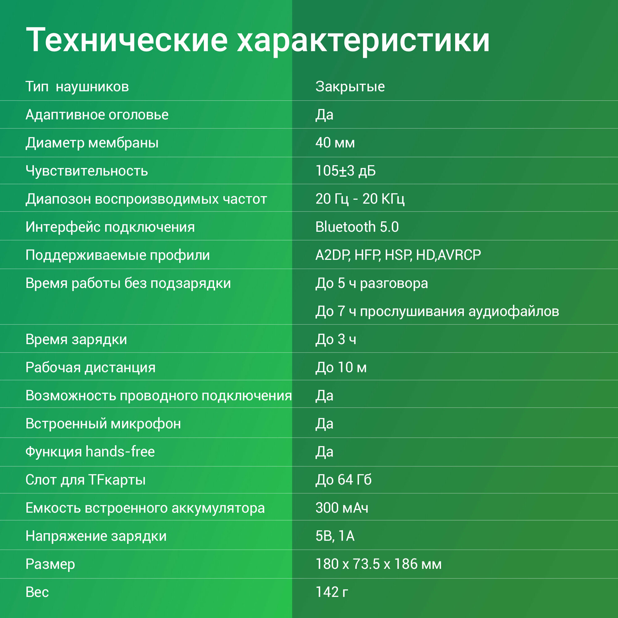 | Емкость аккумулятора наушников | 300 мА·ч |